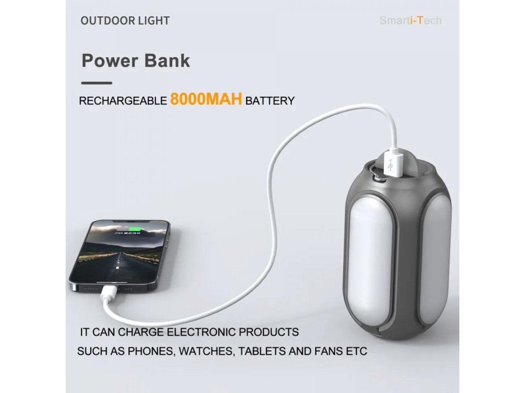 * Poate fi folosită ca sursă de alimentare mobilă: această lampă de camping are o baterie încorporată de 8000 mAh de mare capacitate cu un port de ieșire USB 5V DC 2A pentru a vă încărca rapid telefonul mobil, iPhone-ul, tableta și alte dispozitive prin cablul de încărcare USB atunci când faceți drumeții sau camping.