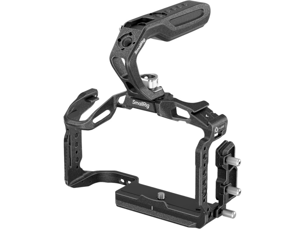 Kitul este echipat cu o varietate de interfețe de expansiune, cum ar fi găuri filetate de 1/4"-20, găuri de poziționare de 1/4"-20, găuri filetate de 3/8"-16, suporturi pentru patina de fixare, placă de eliberare rapidă Arca-Swiss, găuri de poziționare ARRI de 3/8"-16, interfețe QD și găuri pentru curea, permițându-vă să atașați monitoare, microfoane, trepiede, dispozitive de urmărire, mânere și alte accesorii pentru crearea versatilă de conținut video.Carcasa fixează camera cu un singur șurub de 1/4"-20 în partea de jos și blocuri de poziționare pe ambele fețe pentru a asigura stabilitatea.