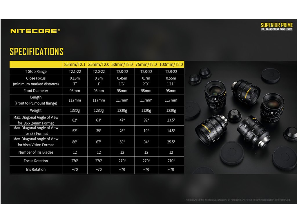 Lentilele de film Nitecore Superior Prime full-frame au o calitate optică optimă și permit regizorilor să-și realizeze cel mai bine tehnicile de expresie artistică. Optimizate pentru senzori în format FF (S46,5 mm), obiectivele Nitecore SP creează mai multe opțiuni pentru regizori și acoperă un format de cadru complet care este pe deplin compatibil cu ARRI Alexa LF, RED Monstro VV, Panavision DXL2, Sony Venice, Canon C700 FF și alte FF camere de luat vederi. Designul optic apocromatic oferă performanțe excelente în ceea ce privește raportul și dispersia axială. Lentilele obțin o redare naturală și pură a culorii, cu o margine violet-verde care abia este vizibilă în sau în afara focalizării. Lentilele Nitecore SP sunt proiectate cu un strat optic unic care controlează în mod ideal dispersia, păstrând în același timp o mulțime de detalii pentru a crea un contrast scăzut și un flare stilizat. Obiectivele Nitecore SP au, de asemenea, o flexibilitate ridicată pentru a fi echipate cu monturi interschimbabile PL, Canon EF și Sony E pentru nevoile diferiților utilizatori de camere. Suportul PL face parte din ambalajul original. Set complet de 25mm T2.1, 35mm T2.0, 50mm T2.0, 75mm T2.0 și 100mm T2.0, inclusiv suport PL și carcasă specială.
