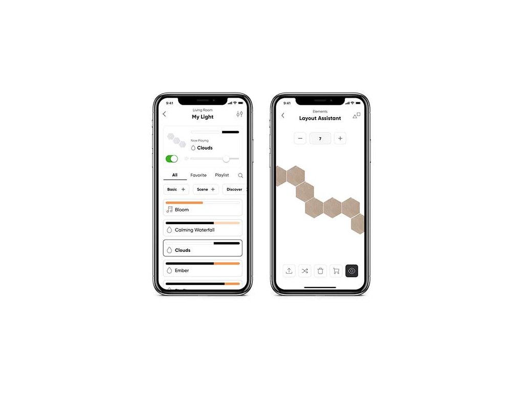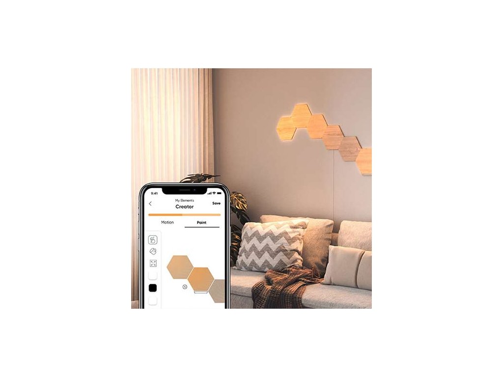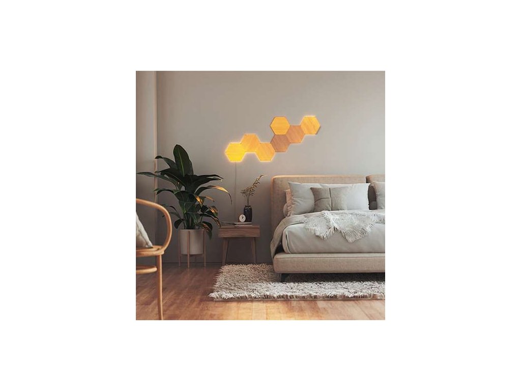 Experimentează o atmosferă unică în casa ta cu iluminare modulară inteligentă. Setul include 7 panouri luminoase din lemn în formă de hexagon, care vor oferi interiorului tău un aspect elegant și natural.