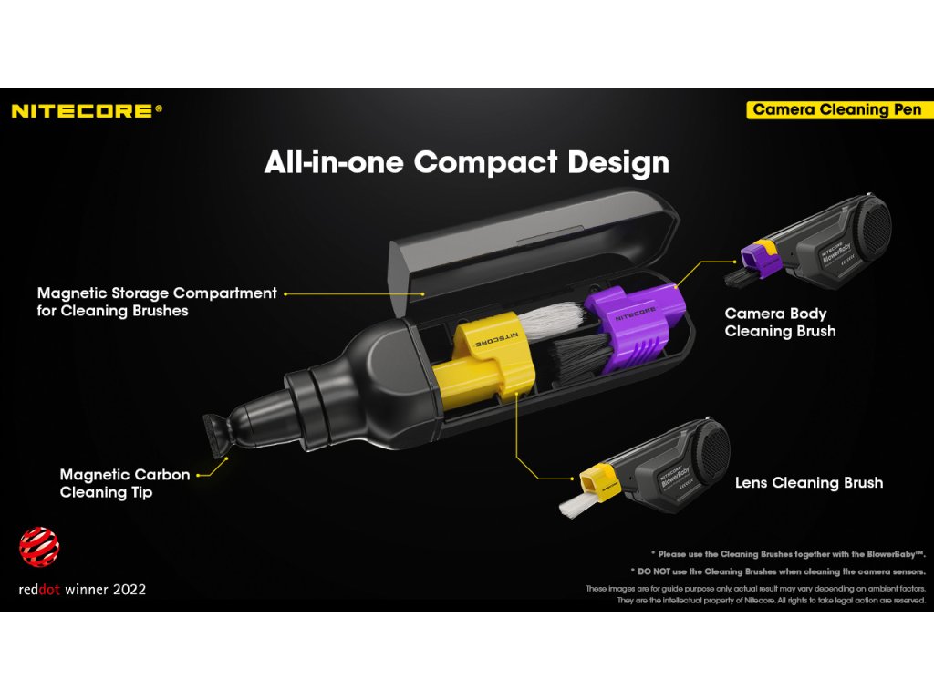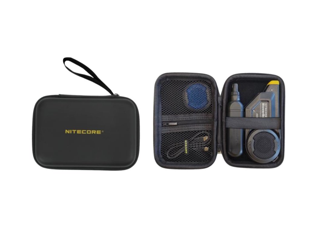Setul Nitecore BlowerBaby include un Nitecore BlowerBaby, un filtru Nitecore CMOS, un stilou pentru curățarea camerei Nitecore și o pungă de depozitare Nitecore BloweBaby.