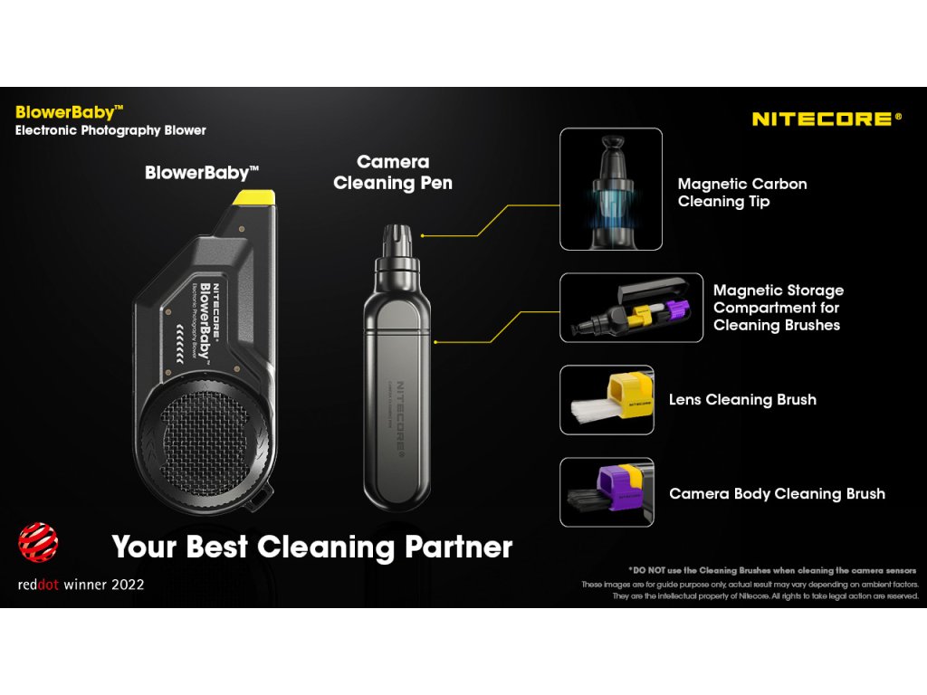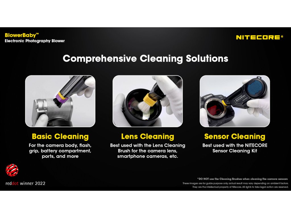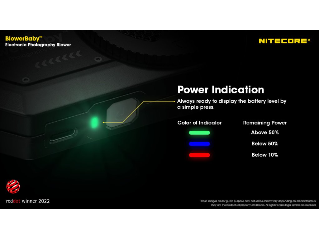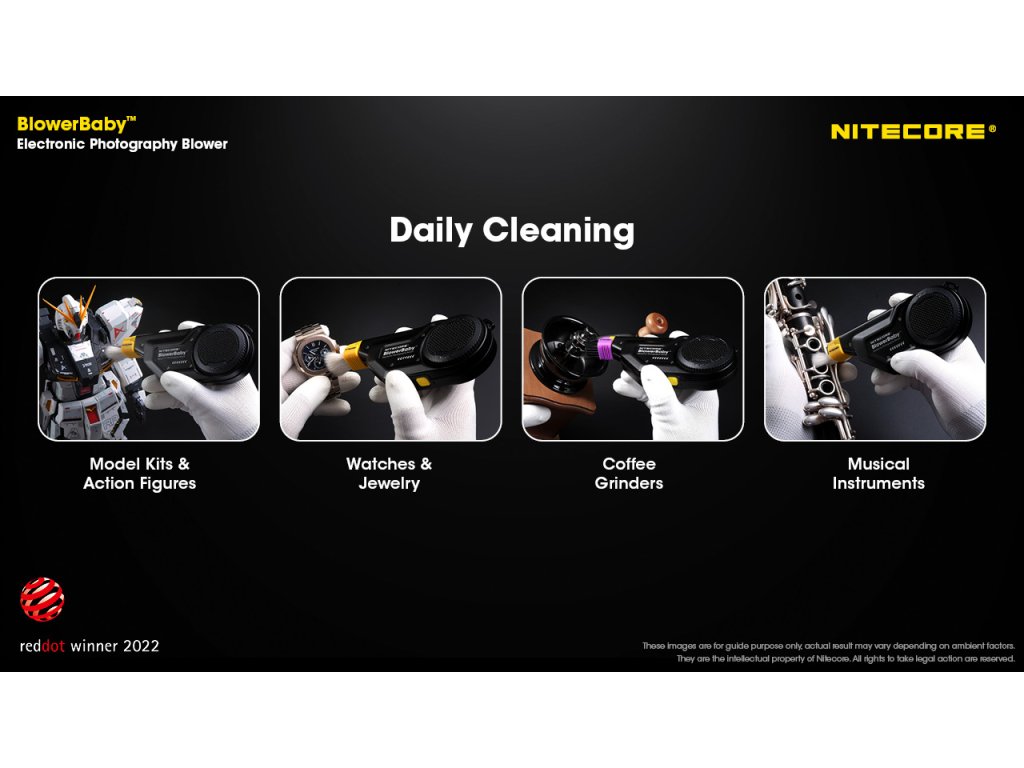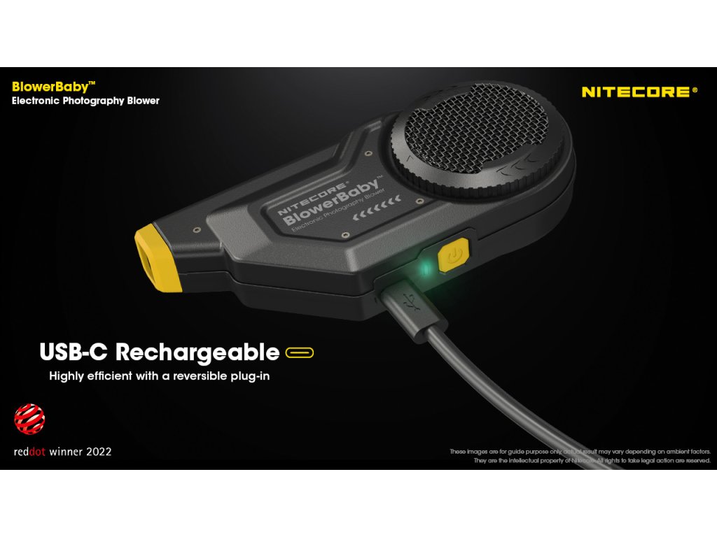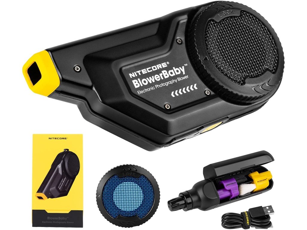 Nitecore BlowerBaby este primul praf reîncărcabil conceput special pentru echipamente fotografice și multe altele. Echipat cu un motor puternic de 26.000 rpm, poate pompa aer la 70 km/h pentru a elimina electronicele lipicioase și lipicioase precum tastatura, componentele computerului, difuzoarele etc. Filtrul poate fi îndepărtat și curățat cu ușurință pentru a îmbunătăți fluxul de aer și pentru întreținerea de rutină, precum și înlocuit cu un filtru special cu senzor antistatic cu o plasă mai fină pentru a proteja senzorul delicat al camerei. BlowerBaby are o baterie reîncărcabilă încorporată de 1500 mAh care poate alimenta ventilatorul pentru peste 15 minute de utilizare continuă sau 90 de utilizări în rafale de 10 secunde. Un indicator de nivel al bateriei în trei culori vă informează când este timpul să vă încărcați; conectați cablul USB-C pentru încărcare rapidă la capacitate maximă în 1,5 ore.