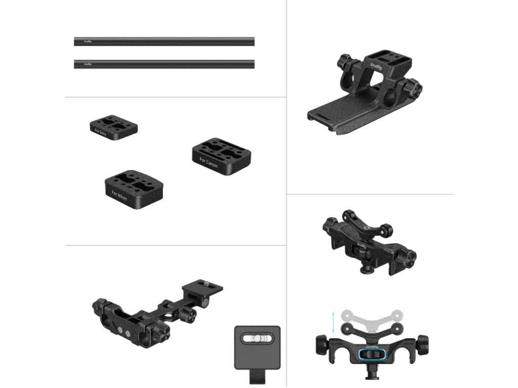 Corpul camerei este conectat la sistemul cu tije duble printr-o balama, oferind compatibilitate flexibilă și reglabilă cu diverse modele de camere.