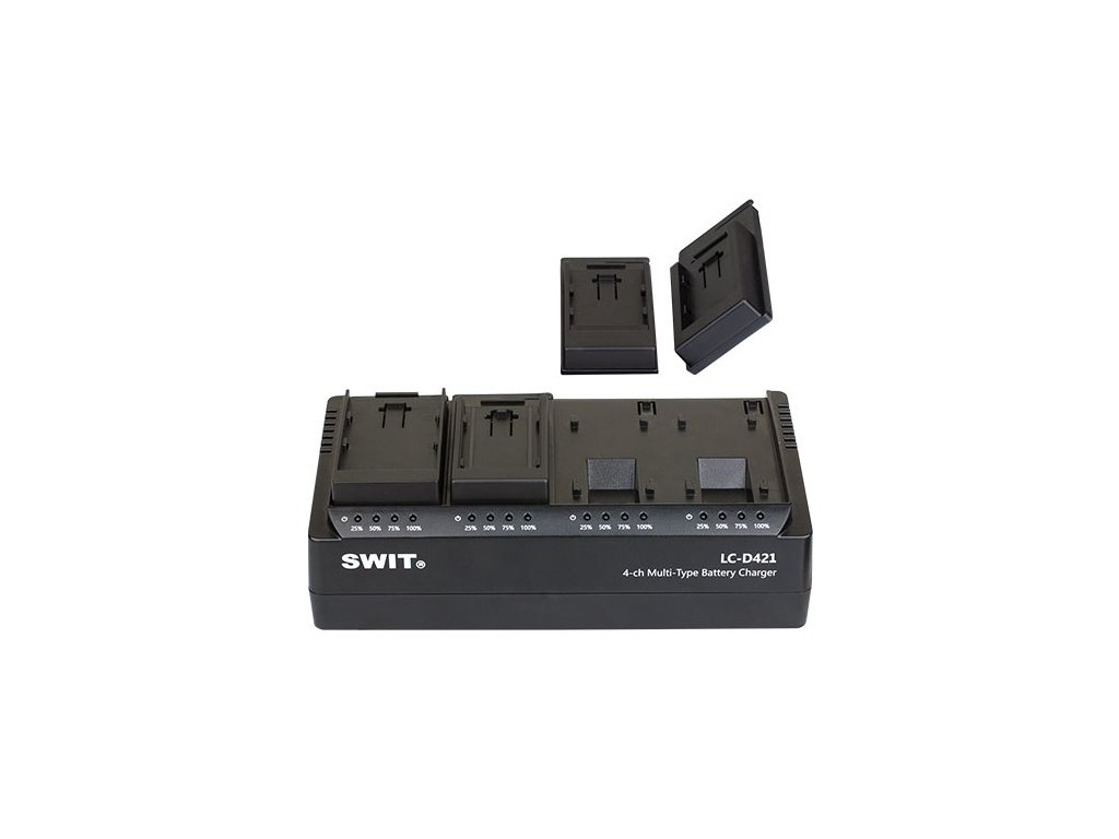 Încărcător SWIT LC-D421 cu 4 canale cu plăci opționale pentru baterie. Încărcătorul LC-D421 conține încărcătorul în sine (fără plăci) în care pot fi selectate până la 4 plăci diferite pentru baterii pentru camerele Sony, Panasonic, JVC sau Canon. O soluție avantajoasă dacă aveți mai multe dispozitive și dispozitive diferite - un încărcător pentru aproape toate bateriile și dispozitivele.