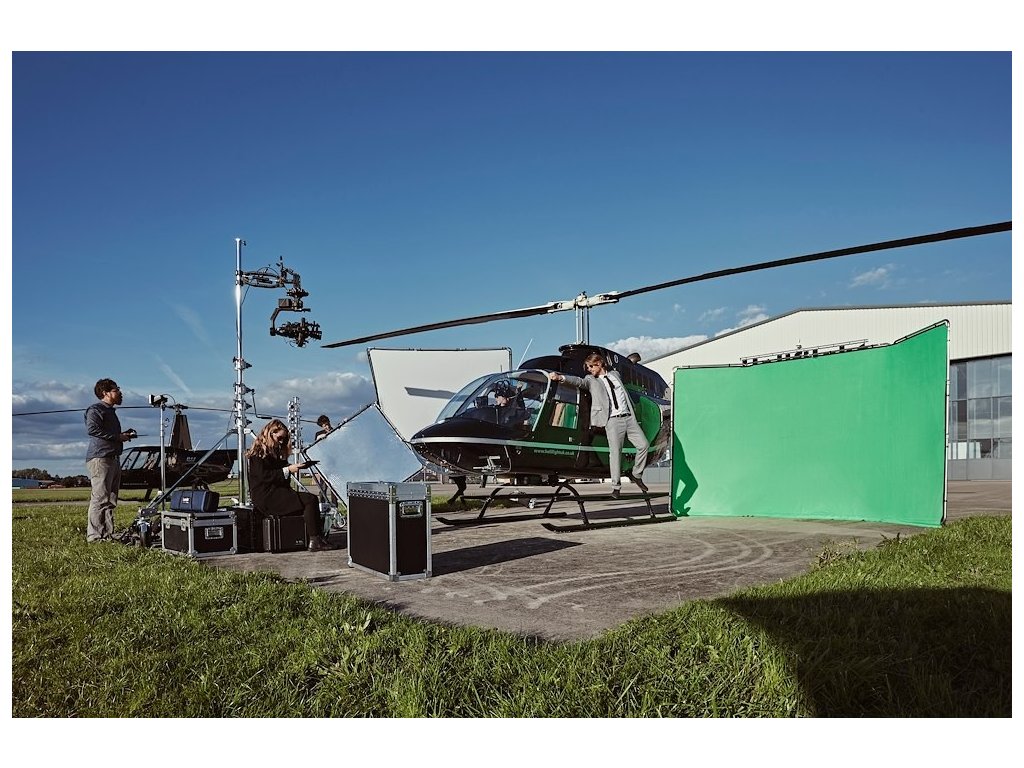 Un fundal panoramic cu trei părți de construcție din aluminiu care asigură că nu sunt necesare suporturi sau trepied pentru a monta fundalul. 4x2,3m