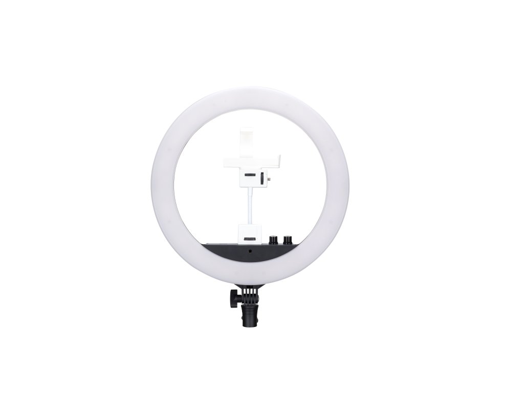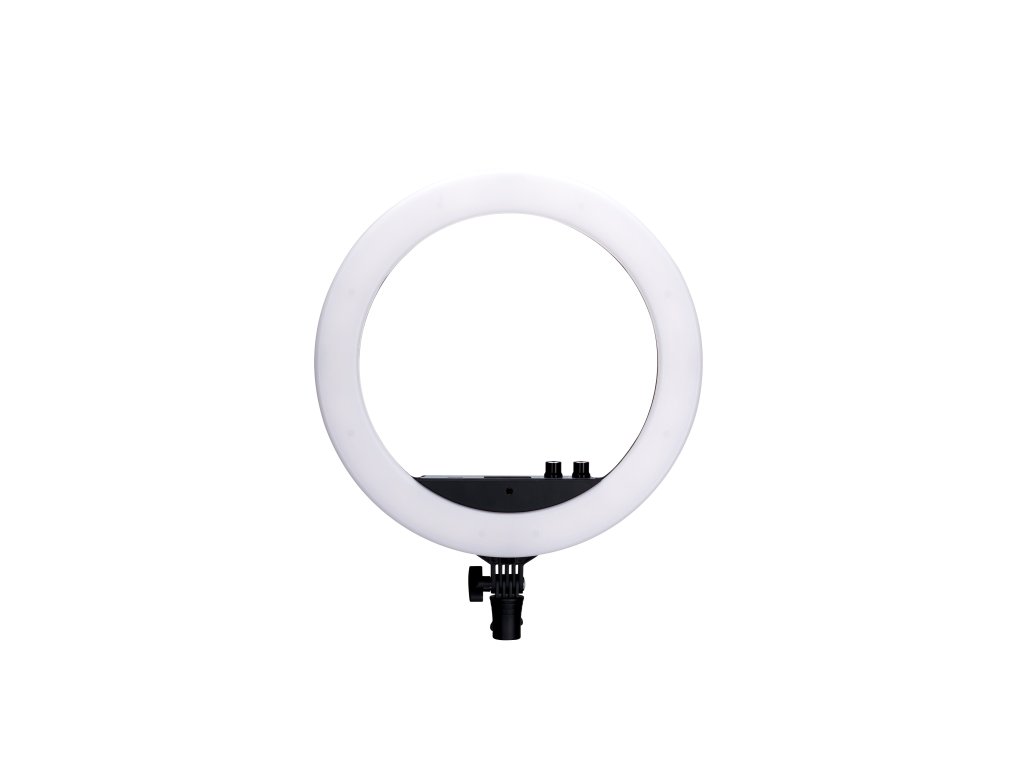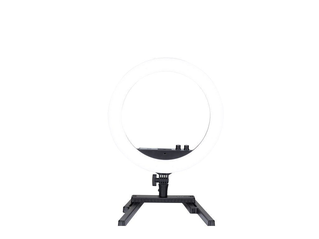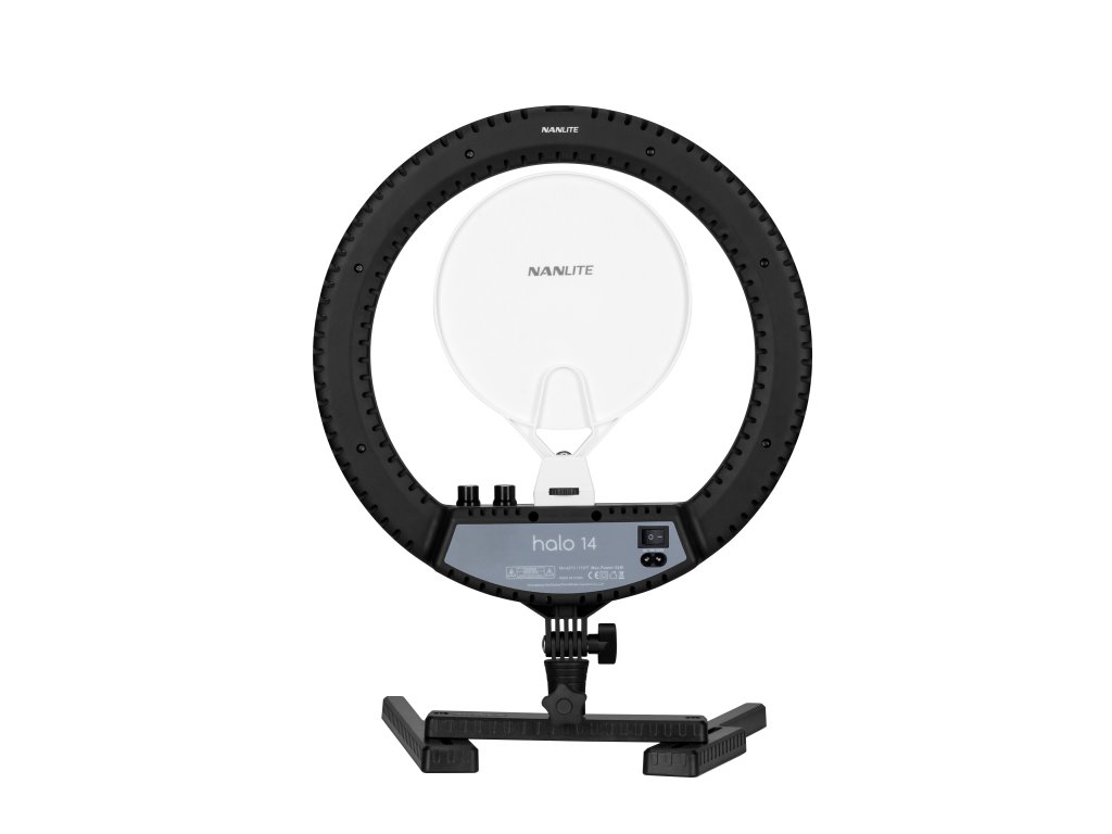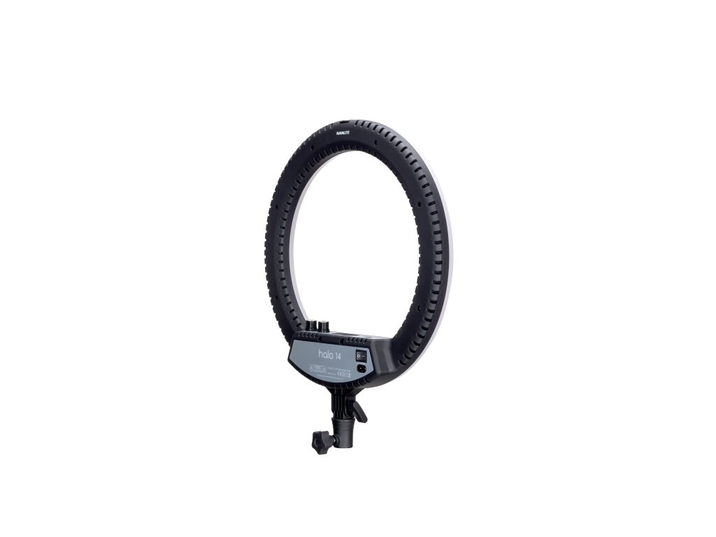 Butoanele de control situate central, accesibile din față și din spate, permit rapidsetarea intensității luminii de la 0% la 100% și, de asemenea, culorile dorite de lumină înde la cald (2700 K) la rece (2700 - 6500 K) pentru a se potrivi cu alte lumini, condiții de lumină ambientală sau pentru a oferi alte posibilități creative. Datorită acestor caracteristici, este, prin urmare, posibilă utilizarea luminii circulare Nanlite Halo 14, de exemplu, pentru machiajul perfect și iluminarea ulterioară a unei conferințe telefonice online.Dimensiuni compacte