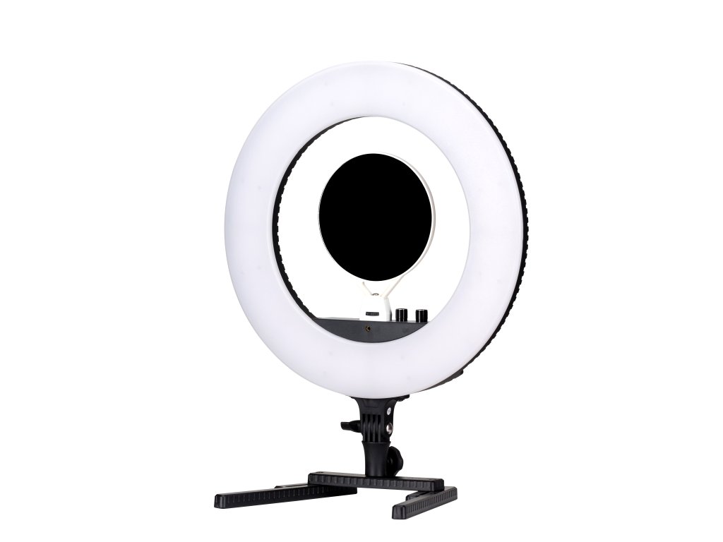 Inel de lumină LED în două culori, reglabil, Nanlite Halo 14 alimentat de un adaptor de curent alternativ. Pachetul mai include un suport pentru telefon, o oglinda de machiaj, o carcasa de transport si un suport practic de masa.Lumină ideală pentru crearea online