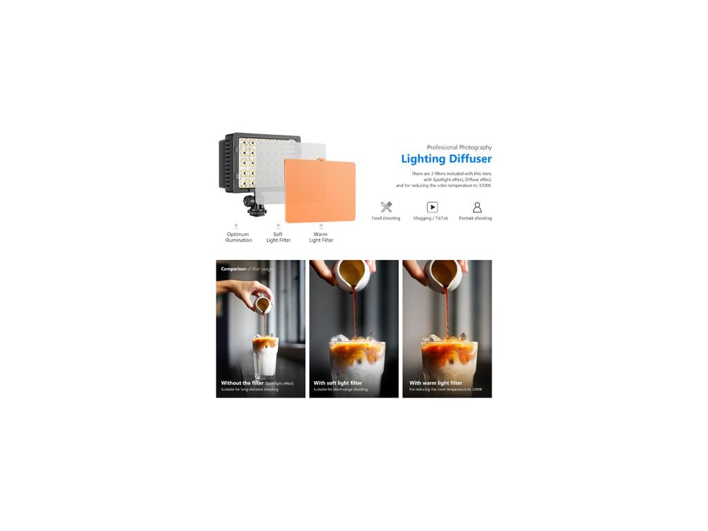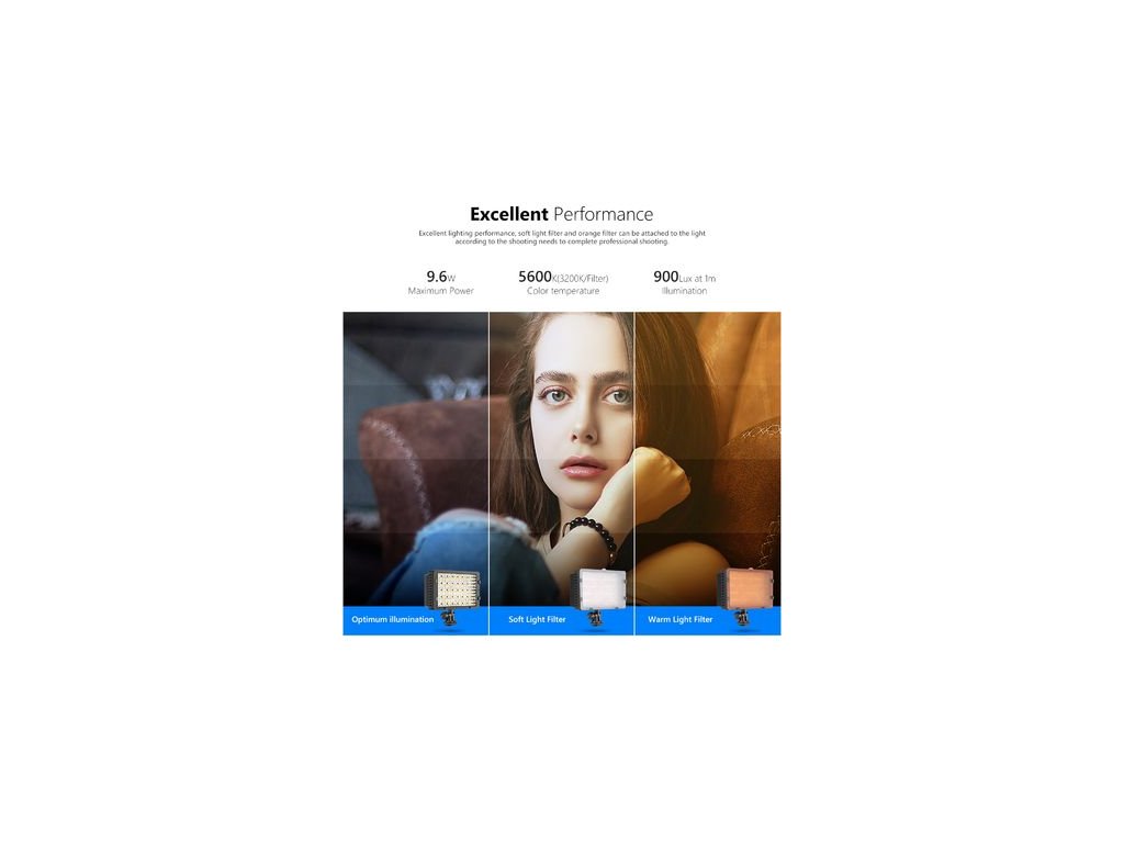 Lumina foto, 160 LED-uri, 10 W, temperatura luminii 3200K sau 5600K, filtru portocaliu si transparent, luminozitate reglabila, luminozitate 660 lm, intensitate luminoasa 900 luxParametri suplimentari