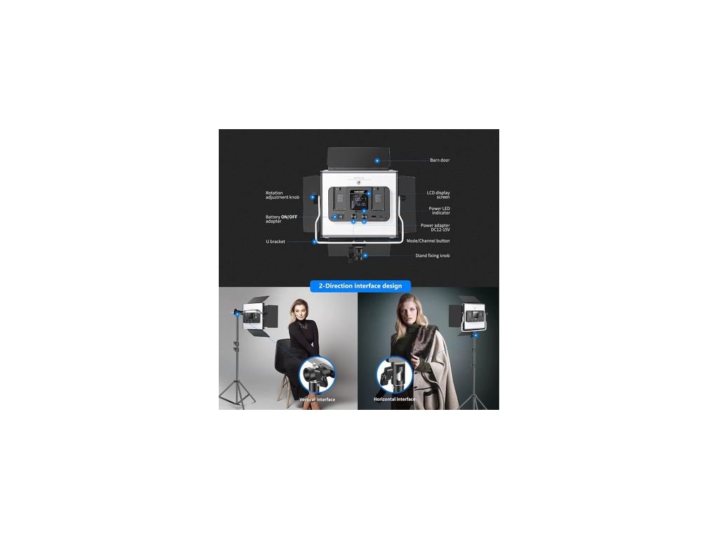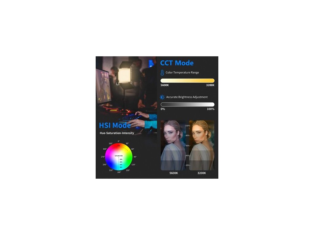 Lumină fotografică puternică în două culori și RGB, 170x cald 2500K, 170x rece 5600K, 320x RGB, 50W, intensitatea luminii 2200 Lux/1m, temperatura luminii reglabilă de la 3200KParametri suplimentari