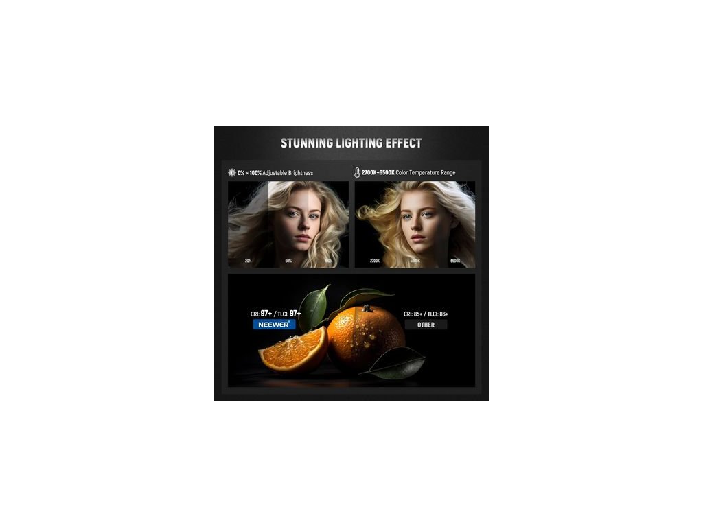 Lumină foto puternică de studio BI-Color, 70 W, intensitatea iluminării 18000 lux/1 m, temperatura luminii reglabilă de la 2700 K la 6500 K, control continuu al luminozității 0-100% în pași de 1%Parametri suplimentari