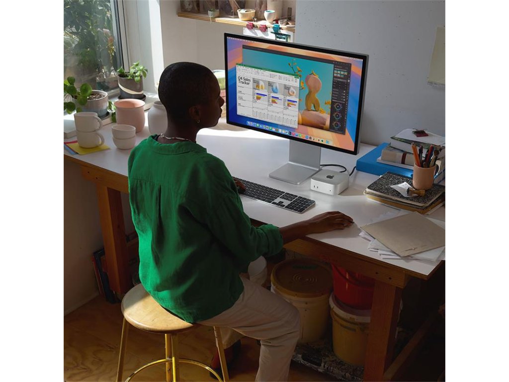 Mac miniAvând dimensiuni de doar 12,7 x 12,7 cm, este conceput să se potrivească chiar sub monitor. Designul său compact vă permite să îl amplasați practic oriunde, eliberând spațiu pe birou.