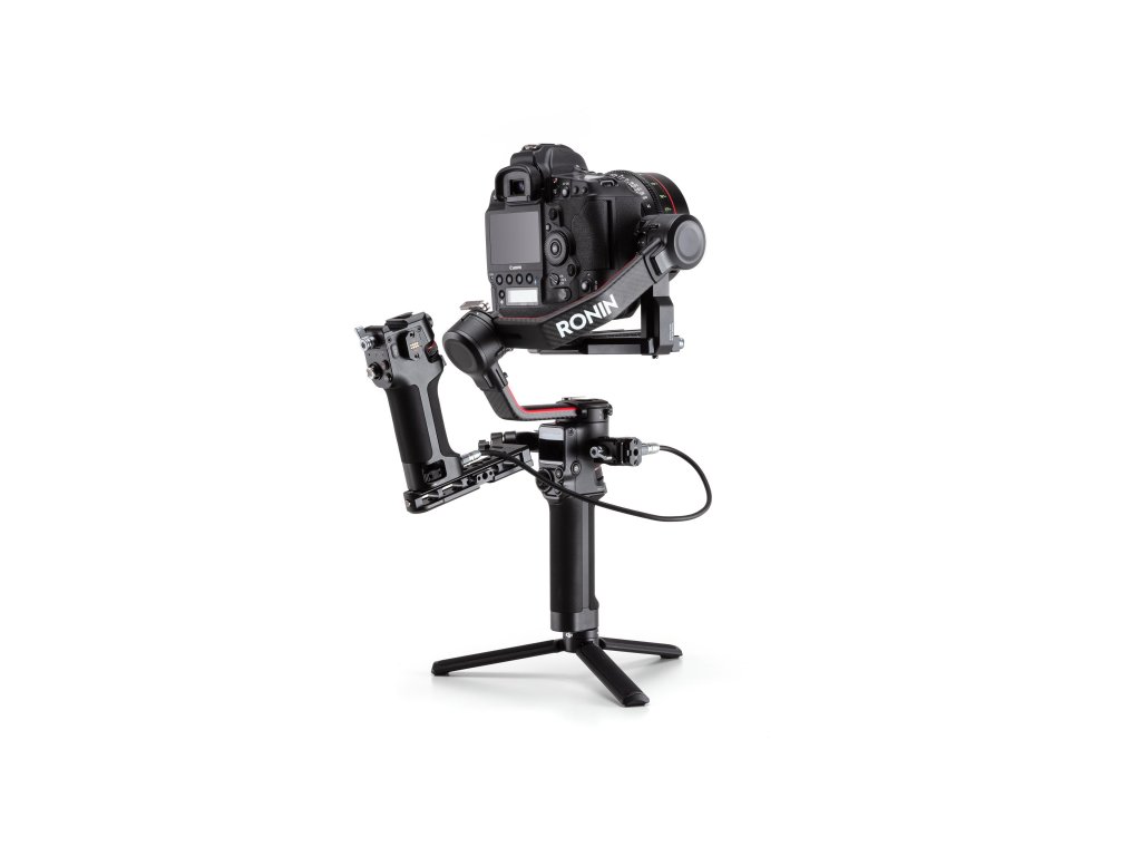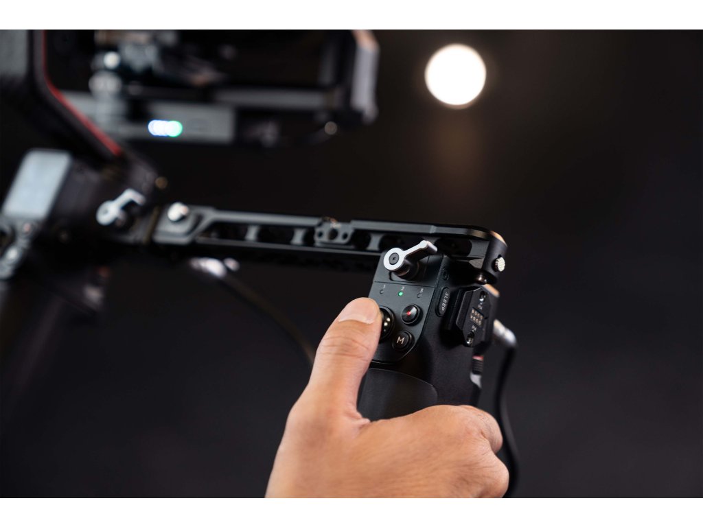 Mânerul de control legat DJI Ronin oferă un control avansat cu fir al focalizării și al parametrilor camerei, declanșatorul camerei și mișcarea stabilizatorului.
