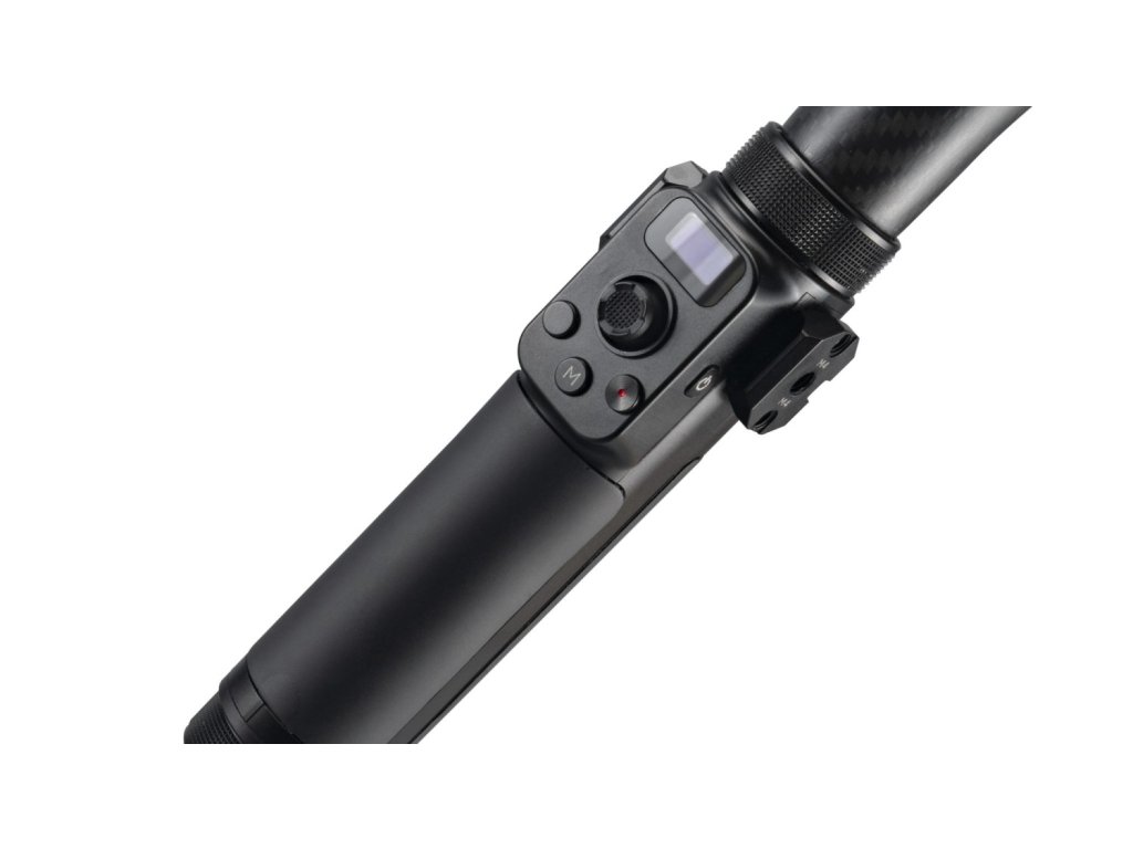 Mânerul pentru telecomandă inclus se atașează pe partea dreaptă a mânerului inel extins pentru acces ușor la setările cardanului, precum și la funcțiile de înregistrare și fotografiere ale camerei.