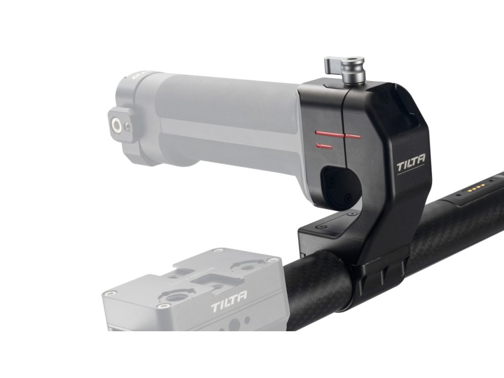 Mânerul de control al lentilelor fără fir cu două canale inclus se atașează pe partea stângă a mânerului inel extins și vă permite să controlați două canale ale motoarelor de control al lentilelor din seria Nucleus.