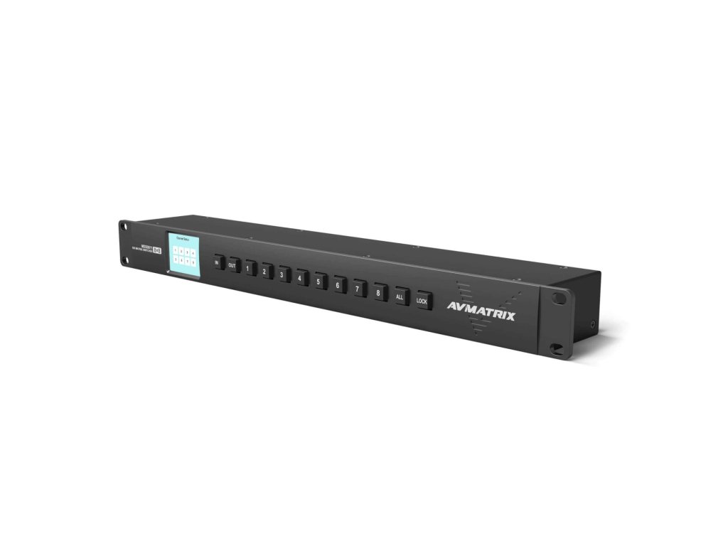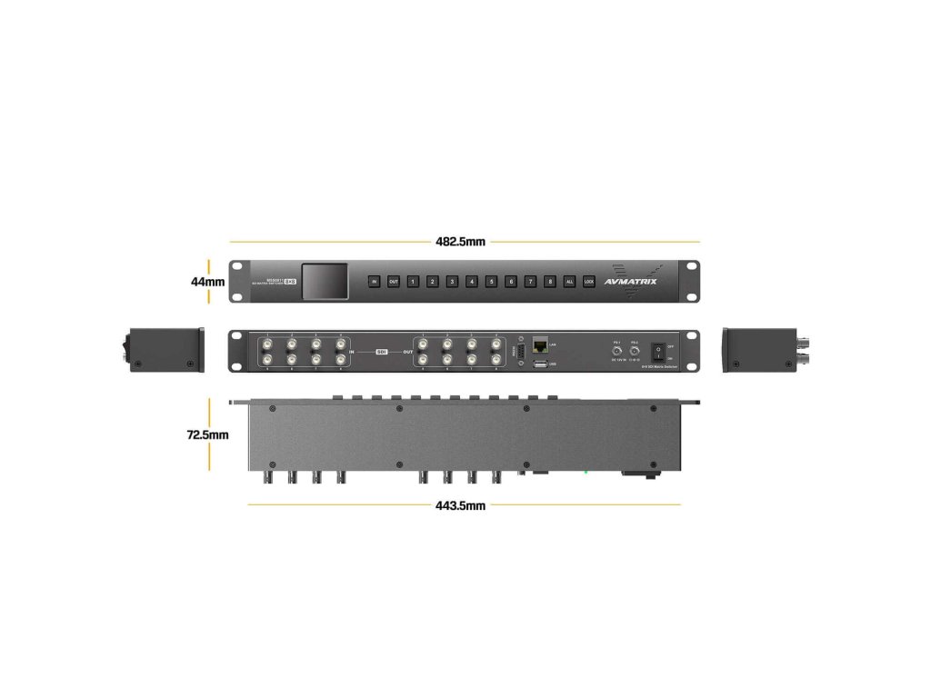 Comutatorul de matrice 1 RU 8 x 8 3G-SDI de la AVMATRIX acceptă opt canale de intrare și le poate direcționa către opt canale de ieșire separate. Dispune de tehnologie multi-format care detectează simultan mai multe surse video SD/HD/3G-SDI (nivel A&B) și DVB-ASI și direcționează mai multe destinații video în 1080, 720, SD, NTSC și PAL. Este controlat de comutatoare manuale din partea frontală a dispozitivului și prin porturile RJ45 și RS-232 pentru controlul software, precum și un port USB Type-A pentru controlul tastaturii. Livrarea include două adaptoare de alimentare de 12 V CC care asigură putere redundantă.