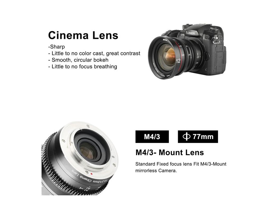 Meike New Cine Lens MK-12mm T2.2, cu deschidere mare, focalizare manuală, primă distorsiune redusă, mini-obiectiv cine compatibil cu camerele Micro Four Thirds M43 MFT Olympus Panasonic Lumix și BMPCC 4K Zcam E2