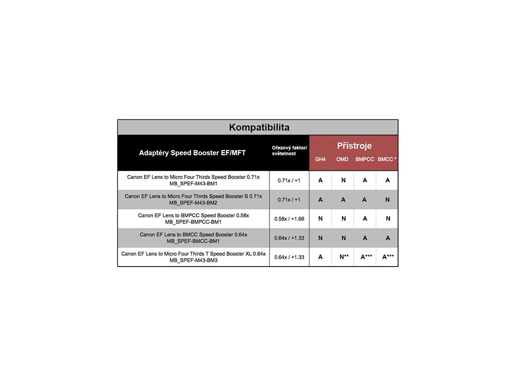 Speed Booster XL 0,64x de la Caldwell Photographic Inc. și Metabones este un nou adaptor Speed Booster cu montură Micro-4/3, conceput exclusiv pentru Panasonic GH4 și alte camere selectate Micro Four Thirds cu mărire de 0,64x. Speed Booster XL 0.64x folosește o construcție optică avansată cu 6 elemente pentru a obține performanțe optice excepționale la diafragme de până la un incredibil f/0,80, un nou record pentru formatul Micro Four Thirds. Adaptorul este compatibil cu Blackmagic Cinema Camera MFT, Blackmagic Pocket Cinema Camera, Panasonic DMC-GH4 și unele modele mai vechi de camere MFT, inclusiv Panasonic GH3 și Olympus E-PL7. Versiune pentru obiectivele Canon EF.