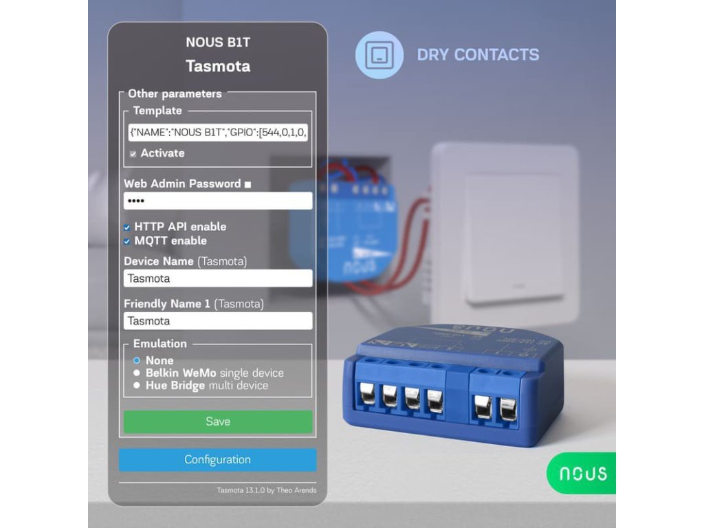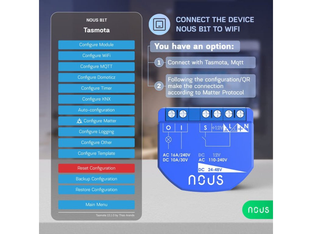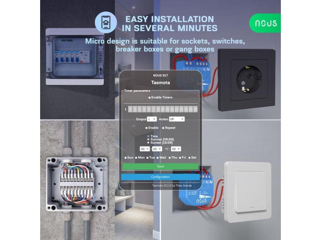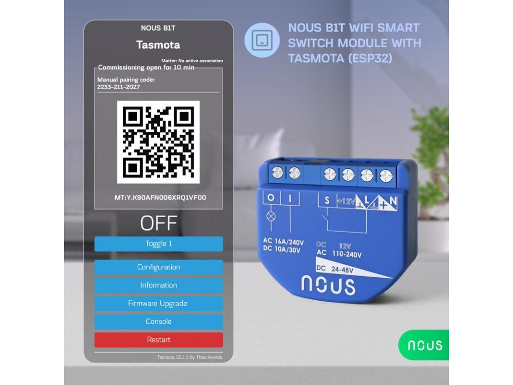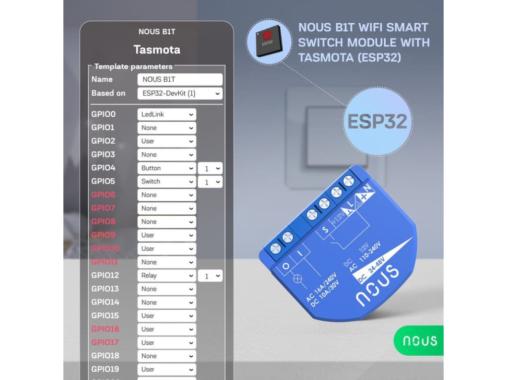 Modul comutator WiFi Tasmota Nous B1T (1 canal, fără măsurare consum, ESP32)