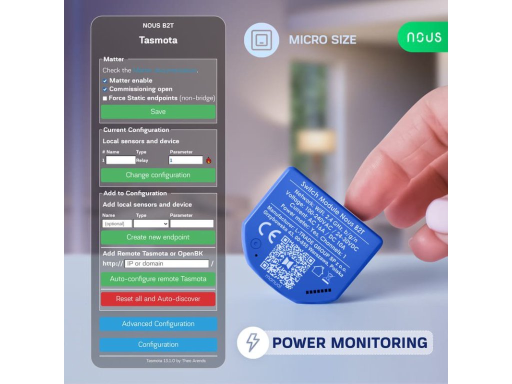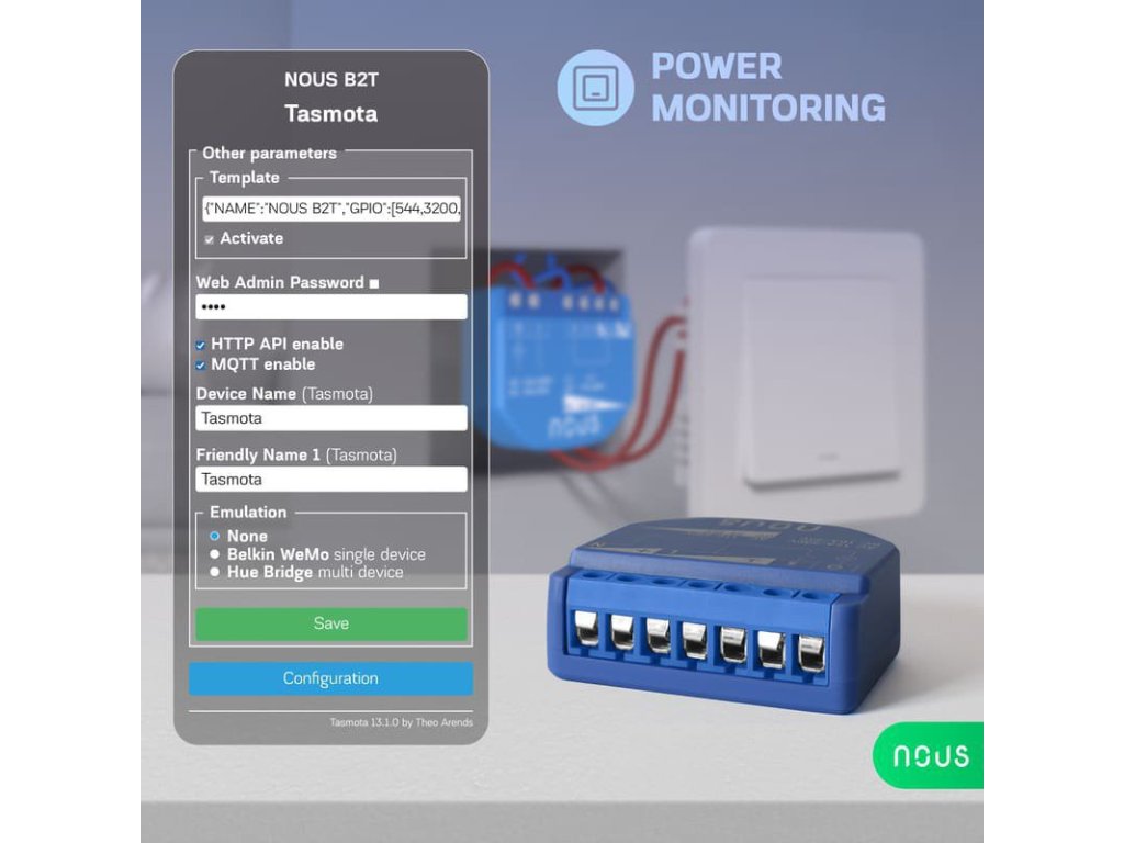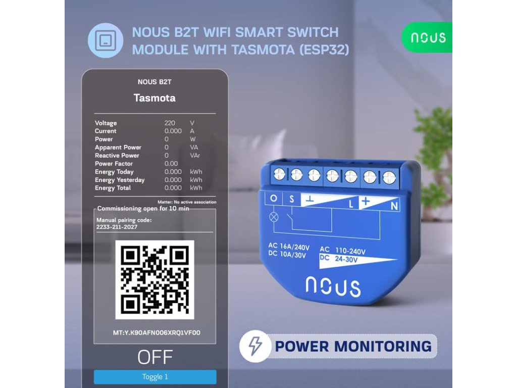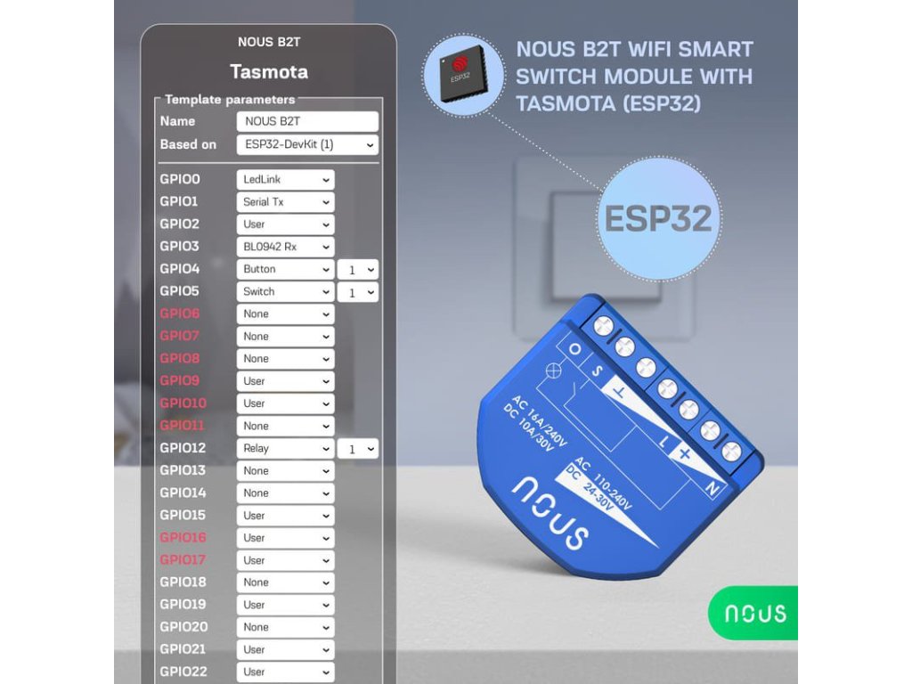 Modul comutator WiFi Tasmota Nous B2T (1 canal, măsurare consum, ESP32)