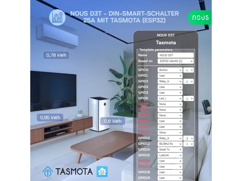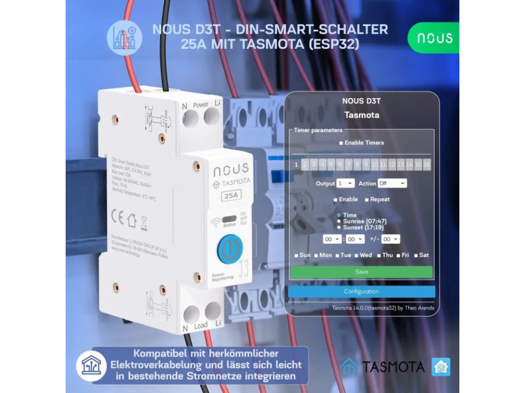 Modul de comutare inteligentă Nous D3T DIN 25A cu firmware Tasmota (1 canal, cu măsurare consum, ESP32)