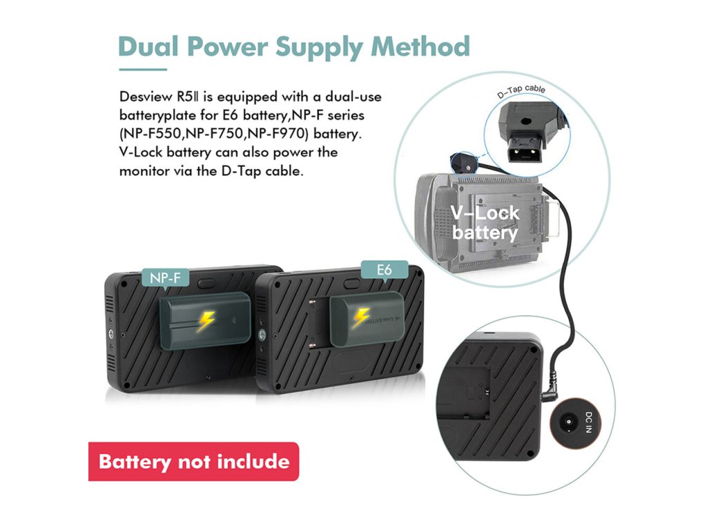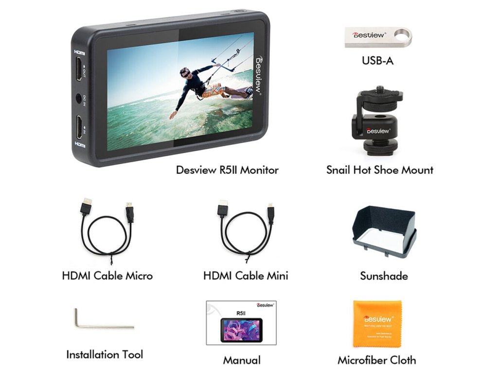 Funcția Monitor tactil R5II de 5,5" pe cameră de la Desview este un monitor de cameră ușor și portabil, cu un afișaj luminos, cu o rezoluție de 800 cd/m2 și un unghi de vizualizare de 178° și o rezoluție a ecranului de 1920 x 1080. R5II este plin de instrumente și funcții utile, inclusiv un ecran tactil și un pic pentru zoom, o intrare HDMI care poate gestiona până la DCI 4K24 și o ieșire HDMI. De asemenea, oferă o mufă pentru căști de 3,5 mm și o intrare USB pentru încărcarea propriilor LUT-uri 3D folosind stick-ul USB furnizat.