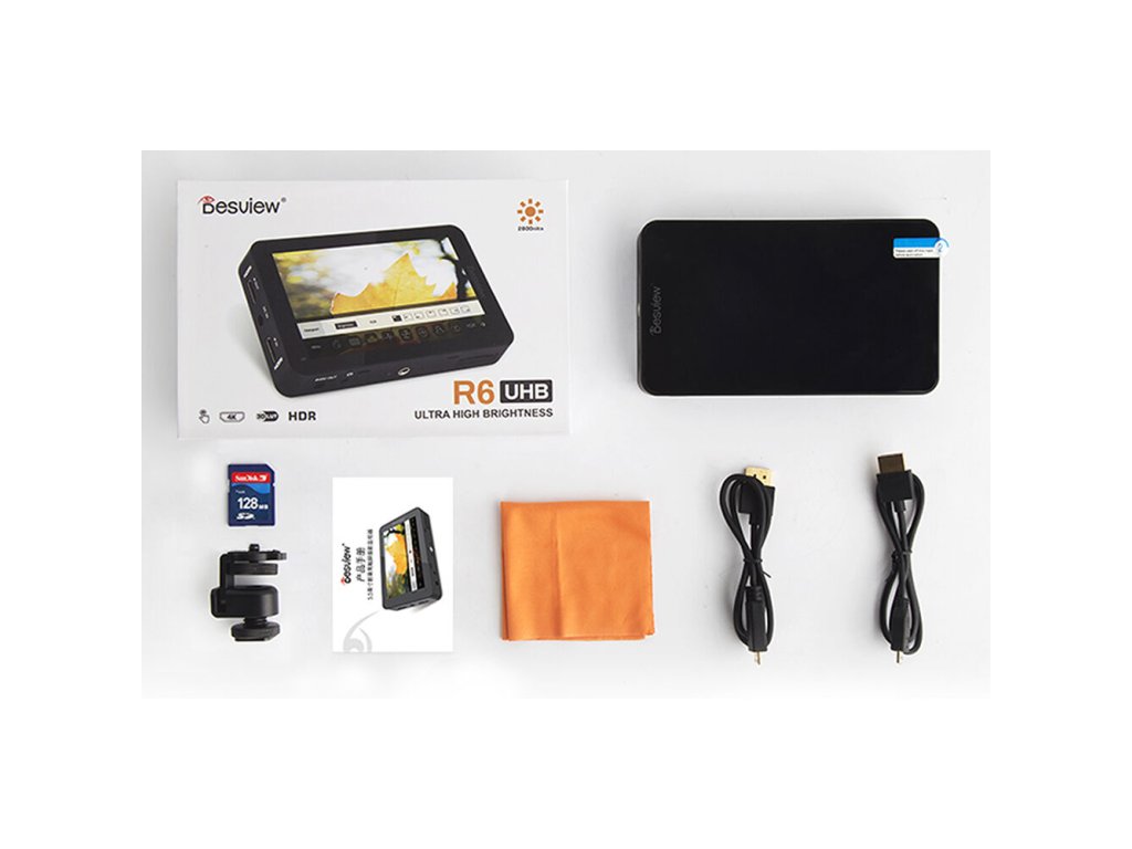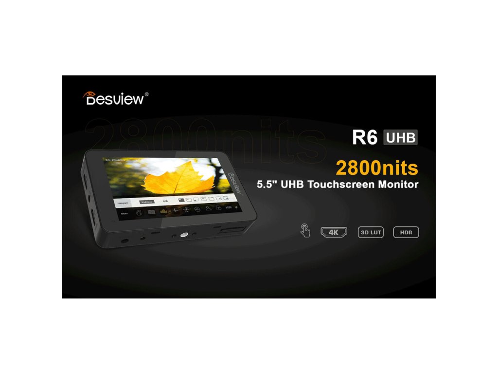TheR6 UHB 5.5'' 2800 cd/m2 monitor tactil cu luminozitate ultra ridicată este un monitor tactil compact de 5,5" pe cameră, cu o carcasă din policarbonat și plastic ABS ușor, dar durabil. Dispune de un afișaj cu rezoluție ultraluminoasă de 1920 x 1080, cu un raport de contrast de 1000:1, potrivit pentru utilizare în aer liber, fără parasolar și sistem integrat. Senzorul -in vă permite să lăsați monitorul să ajusteze automat luminozitatea ecranului. Monitorul acceptă DCI 4K24 și 4K30 UHD prin intrarea HDMI, scalarea semnalului pentru afișaj și ieșirea HDMI vă permit să trimiteți semnalul original neajustat al camerei către alte monitoare sau să vă conectați la un transmițător fără fir pentru o transmisie mai ușoară.