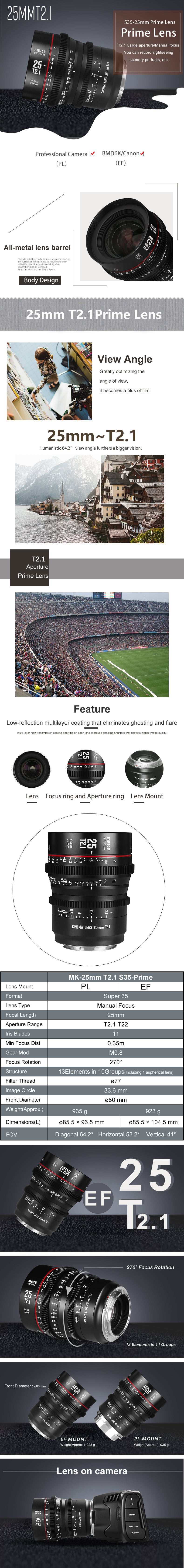Al patrulea obiectiv de film Meike din seria Super35-Prime Cine Lens: Meike 25mm T2.1. Cu un cerc de imagine de 33,6 mm, se potrivește camerelor în format Super 35 și vine cu două monturi, PL/EF. Acest obiectiv este una dintre noile serii de lentile de film Super35-Prime de la Meike. Are roți standard de 0,8 mm pe inelele de focalizare și deschidere.