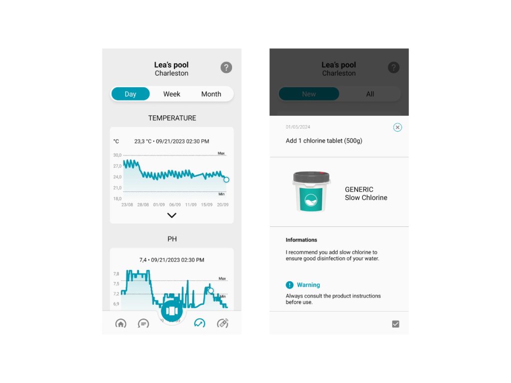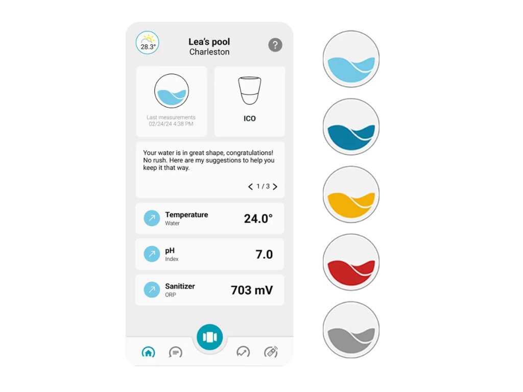 Tehnologia de ultimă oră încorporată într-un dispozitiv de design durabil se va balansa subtil pe suprafața zonei dvs. de apă relaxantă și veți obține o imagine de ansamblu perfectă și previziuni personalizate pentru piscina dvs., astfel încât să vă puteți bucura de fiecare dată de baia perfectă.