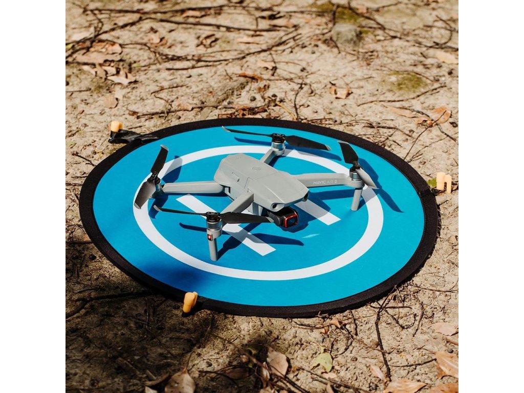 Pad de aterizare pentru dronă cu diametrul de 55cm. Negru - portocaliu cu posibilitatea de a se atașa la sol folosind știfturi. Acest suport portabil și ușor de pliat poate proteja cardanul și camera dronei dvs. în timpul decolării și aterizării pe suprafețe accidentate. Pachetul include și cuie, așa că în caz de vânt puternic, îți poți asigura perna fixând-o pe pământ.
