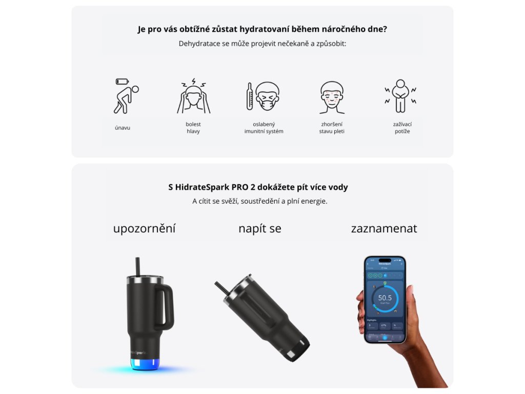 Cei mai mulți dintre noi știm că ar trebui să bem în mod regulat pe parcursul zilei, dar realitatea este adesea alta. Fie că este vorba de serviciu, călătorii sau într-o zi agitată, este ușor să uităm complet să bem. Și de aici...HidrateSpark PRO 2 – un pahar de nouă generație,asta face totul pentru tine. Nu trebuie să setezi cronometre, mementouri pe telefon sau să numeri ceștile.Datorită unui senzor inteligent și alertelor luminoase și sonore, îți va aminti să bei la momentul potrivit.Și de ce este importantă? Deshidratarea cronică este o problemă frecventă, dar trecută cu vederea, care poate duce la oboseală, dureri de cap, dificultăți de concentrare și slăbire a imunității.HidrateSpark este aici pentru a te ajuta să obții și să menții un obicei sănătos.– ușor, intuitiv și fără interferențe.Mai modern, mai inteligent și mai practic ca niciodată