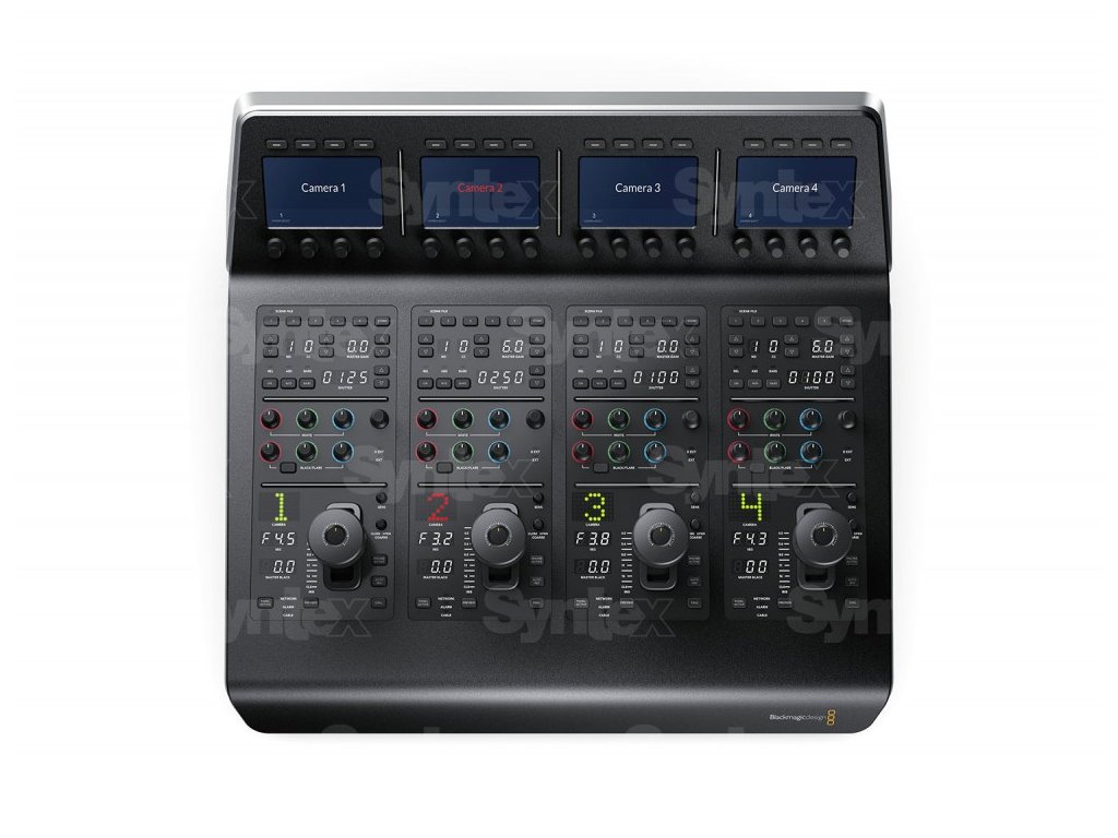 Când lucrați la programe live cu mai multe camere, este important să vă asigurați că toate camerele sunt echilibrate corespunzător și configurate corect pentru a obține videoclipuri consistente din orice unghi. Panoul de control al camerei ATEM include 4 comenzi ale camerei.într-una panoul. Fiecare controler al camerei include un ecran LCD mare cu butoane și butoane funcționale în partea de sus a panoului și un set complet de comenzi profesionale sub panoul principal.