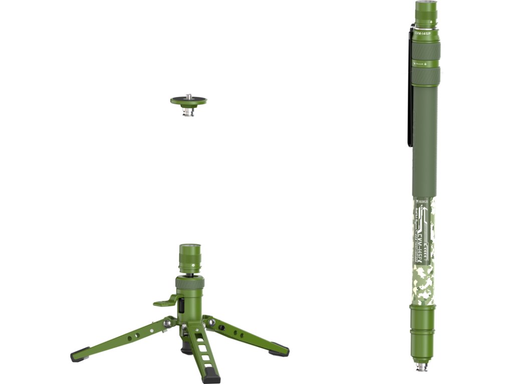 Placa de montare, piciorul monopiedului și baza trepiedului pot fi detașate și combinate după bunul plac într-un monopied, monopied cu picioare sau trepied de masă.