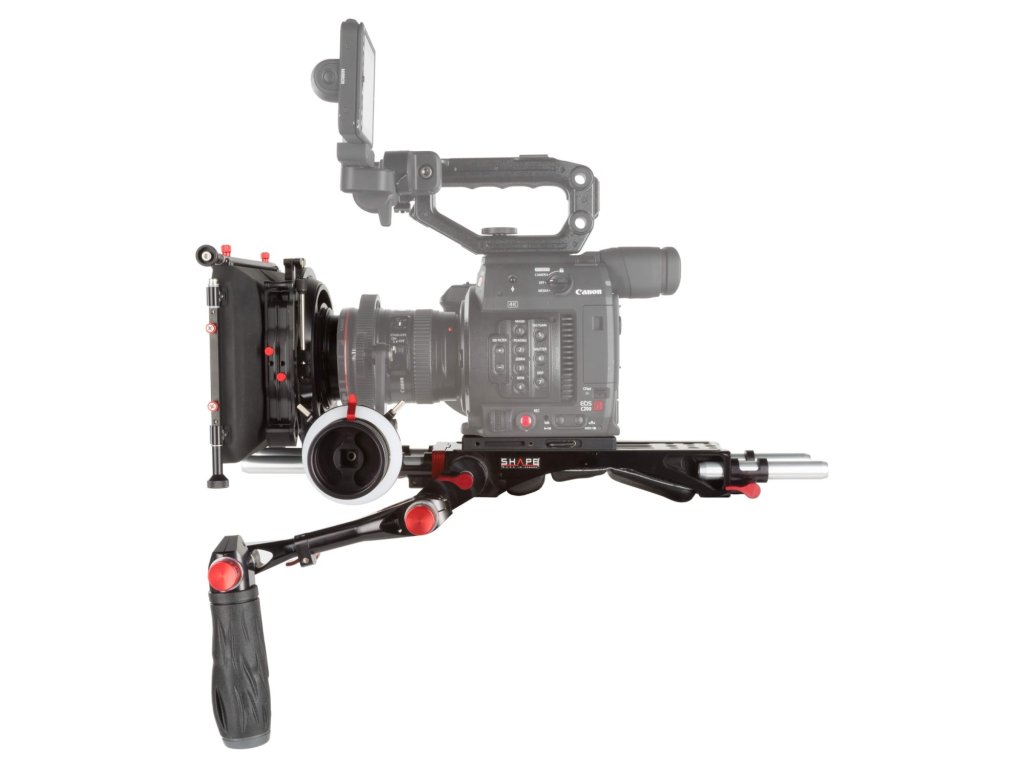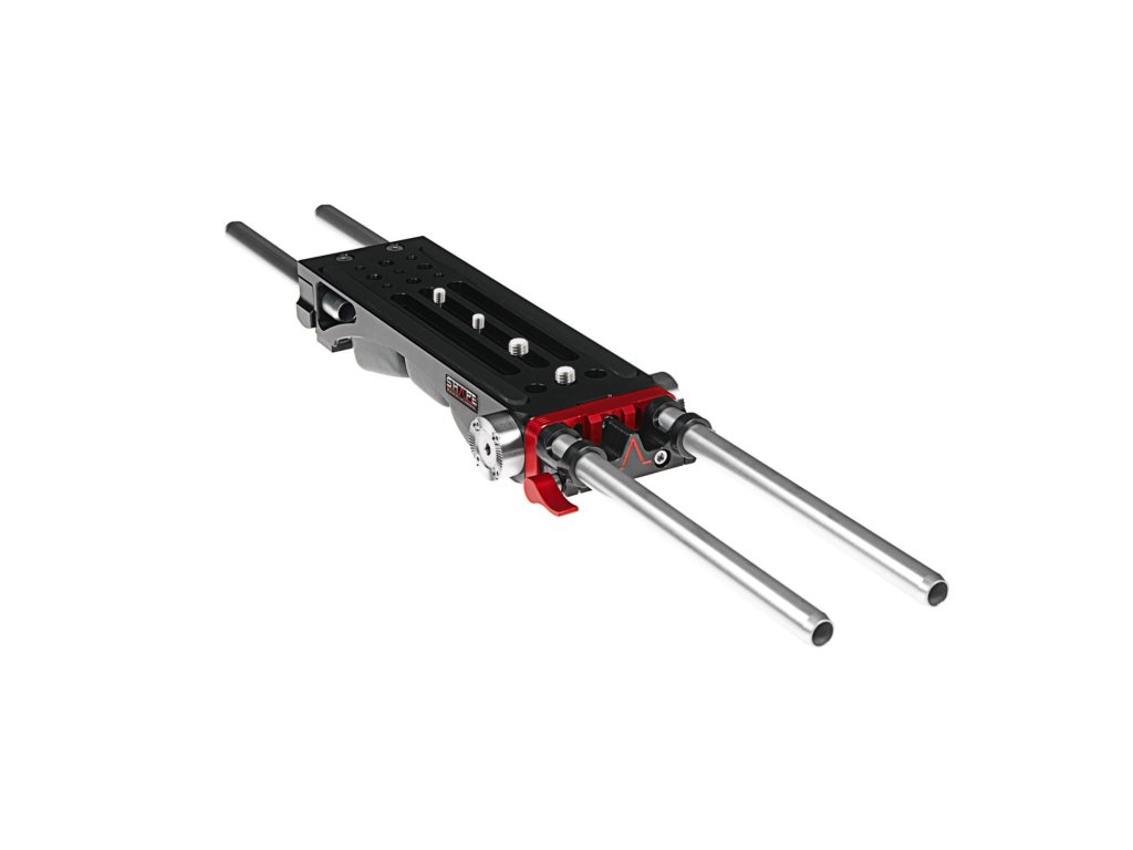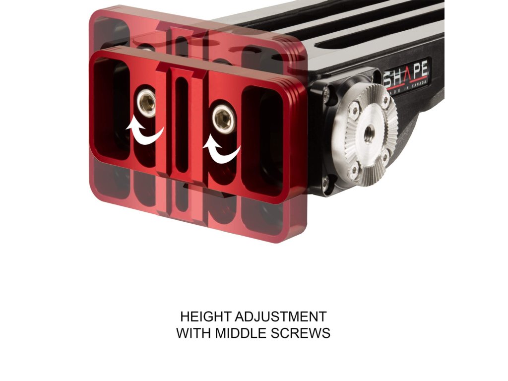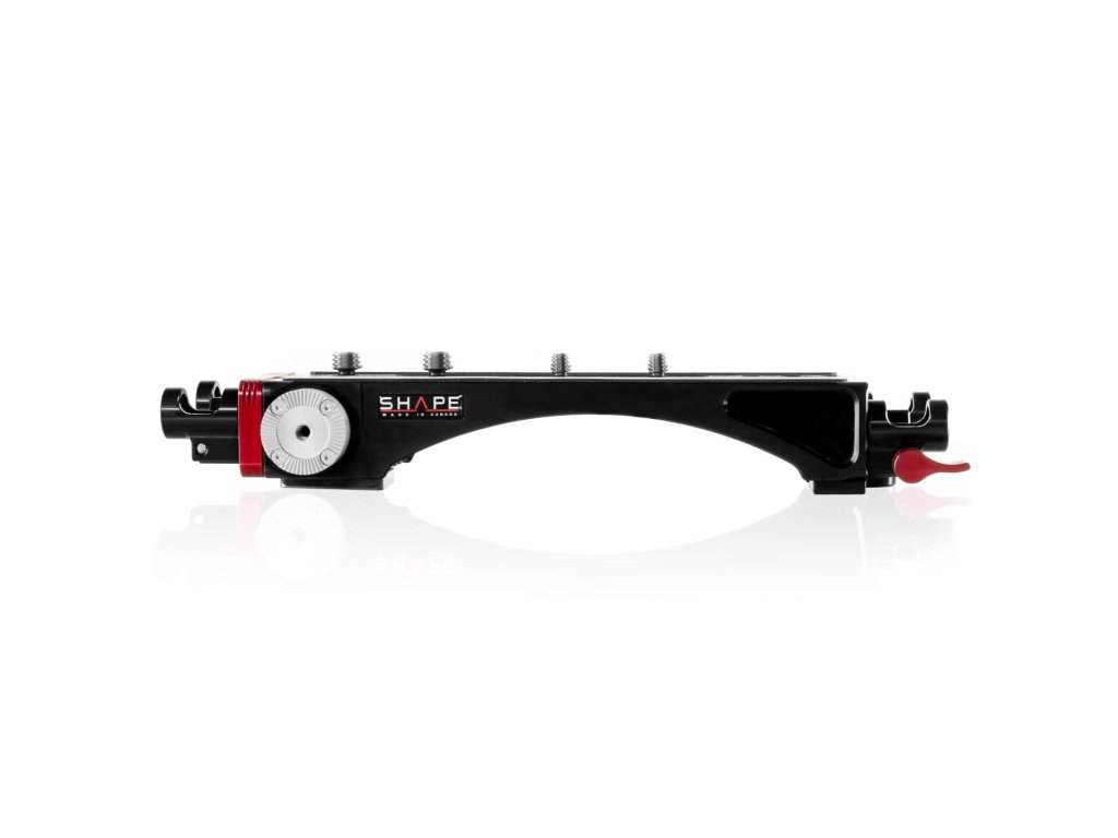 Căptușeala de umăr este prinsă cu fermoare tactile. Firele pentru atașarea trepiedului sunt situate sub suport de umăr. Două perechi de bare de 8” și 4” de 15 mm sunt incluse în față și în spate. Pentru a atașa o cutie mată și alte accesorii, adaptorul tijei poate fi reglat vertical prin îndepărtarea șurubului care îl ține pe loc. Această placă de bază acceptă și adaptoarele opționale SHAPE 15mm Studio și 19mm Studio în locul celui furnizat. Placa de bază include trei sloturi pentru montarea camerei, toate suportând șuruburi de 1/4”-20 și 3/8”-16. Găurile decentrate vă permit să montați un offset al camerei dacă utilizați un adaptor de studio de 15 mm. Filetele de montare multiple de 1/4”-20 și 3/8”-16 sunt situate în spatele celor trei fante pentru atașarea brațelor articulate și a altor accesorii. Pachetul include două șuruburi 1/4”-20 și două 3/8”-16 pentru fixarea camerei.