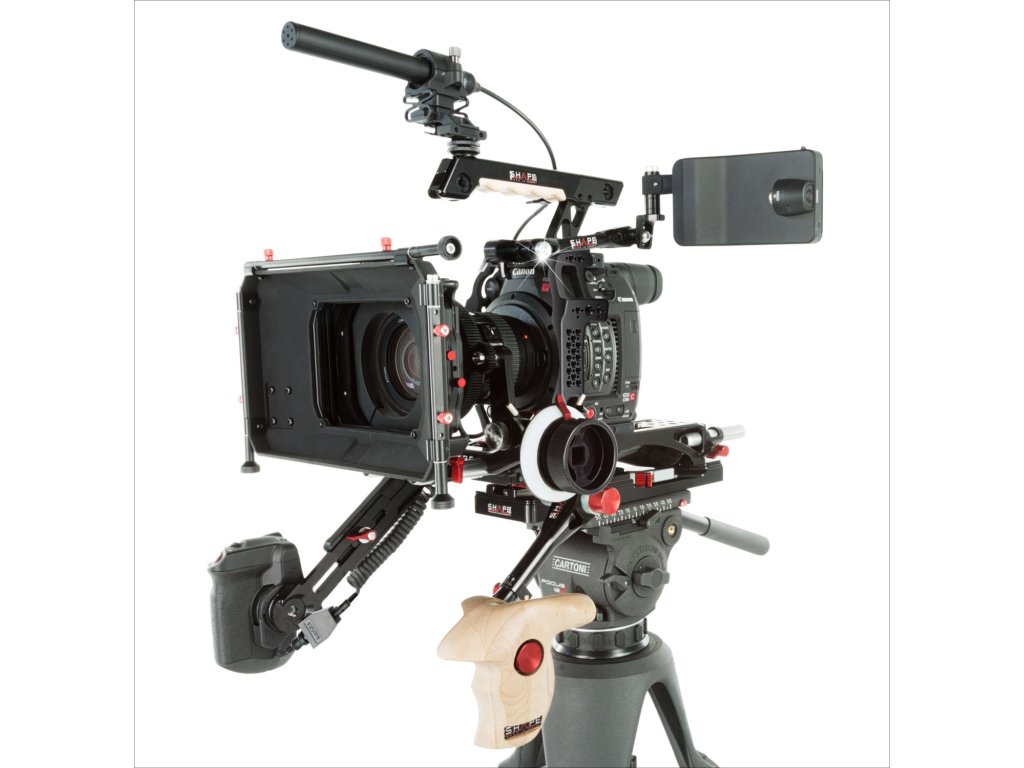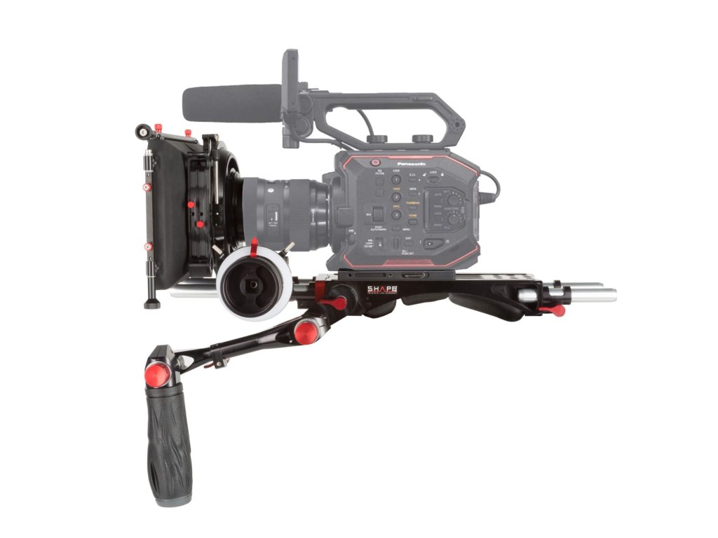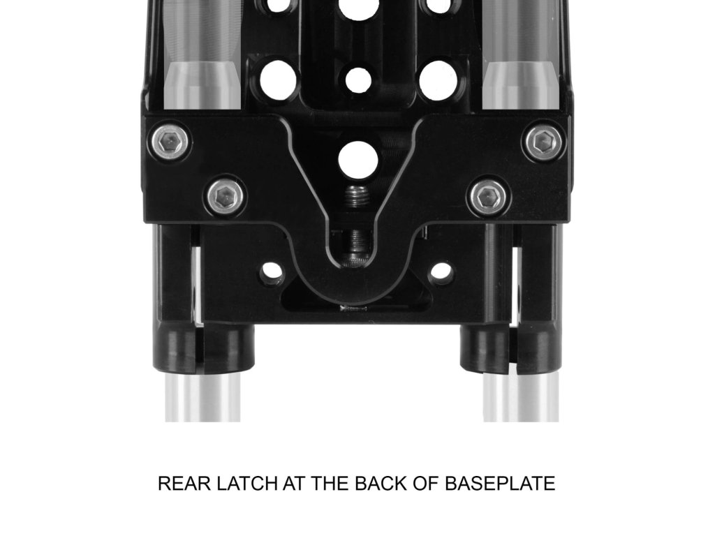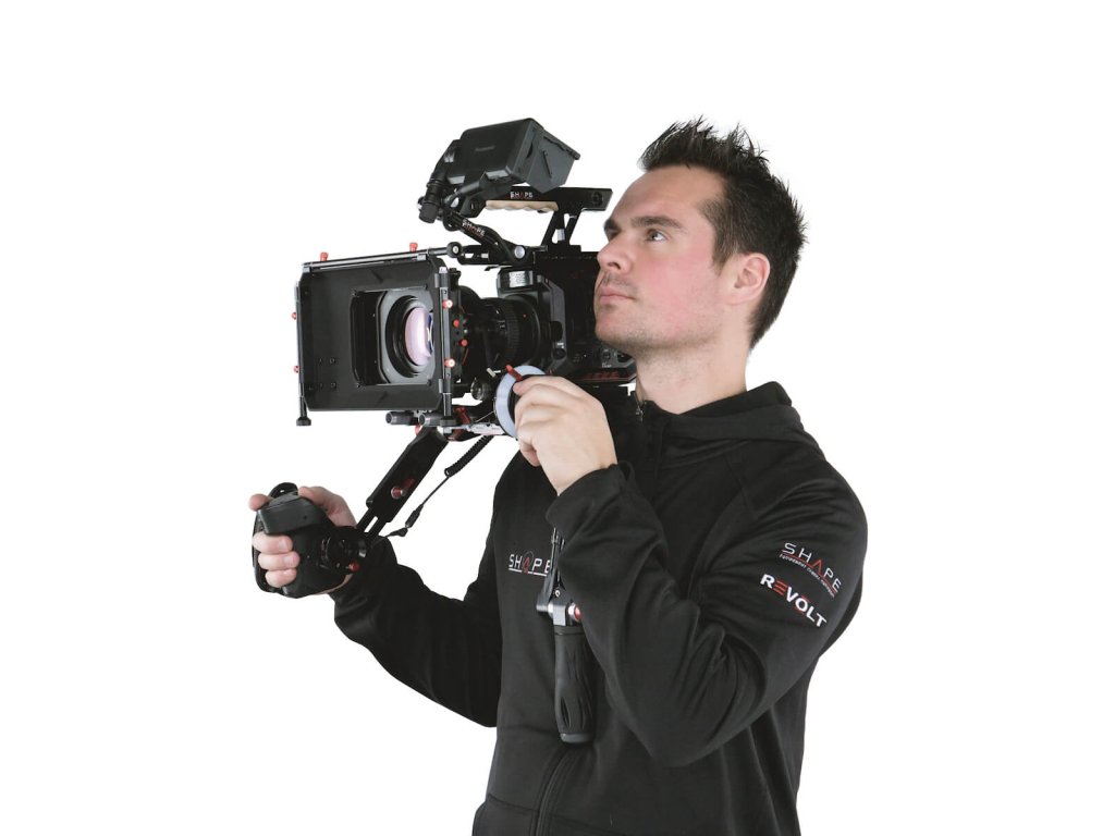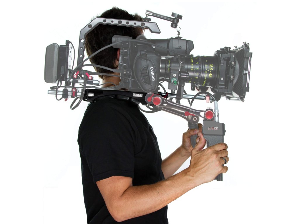 Căptușeala de umăr este prinsă cu fermoare tactile. Firele pentru atașarea trepiedului sunt situate sub suport de umăr. Două perechi de bare de 8” și 4” de 15 mm sunt incluse în față și în spate. Pentru a atașa o cutie mată și alte accesorii, adaptorul tijei poate fi reglat vertical prin îndepărtarea șurubului care îl ține pe loc. Această placă de bază acceptă și adaptoarele opționale SHAPE 15mm Studio și 19mm Studio în locul celui furnizat. Placa de bază include trei sloturi pentru montarea camerei, toate suportând șuruburi de 1/4”-20 și 3/8”-16. Găurile decentrate vă permit să montați un offset al camerei dacă utilizați un adaptor de studio de 15 mm. Filetele de montare multiple de 1/4”-20 și 3/8”-16 sunt situate în spatele celor trei fante pentru atașarea brațelor articulate și a altor accesorii. Pachetul include două șuruburi 1/4”-20 și două 3/8”-16 pentru fixarea camerei.