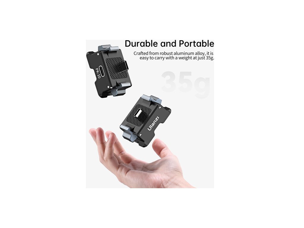 Îmbunătățiți fluxul de lucru cu DJI Osmo Pocket 3 cu suportul USB-C Ulanzi PK-10, o soluție de montare cu 2 pini, proiectată cu precizie, care vă menține alimentat și gata de filmare. Atașați suportul la Pocket 3 în câteva secunde folosind un sistem magnetic sigur, apoi conectați orice cablu USB-C pentru a încărca camera fără a fi nevoie să scoateți suportul - perfect pentru filmări time-lapse mai lungi, vloguri sau transmisiuni live. Acest adaptor compact este fabricat din aliaj de aluminiu durabil cu accente de silicon pentru aderență și protecție, reducând la minimum volumul, permițând în același timp tranziții rapide între gimbaluri, trepiede, suporturi pentru camere sau configurații portabile. Cântărind doar 35 g și măsurând 6,44 x 6,44 x 3,18 inci, se potrivește cu ușurință în orice geantă de cameră. Portul USB-C integrat acceptă încărcarea și funcționarea simultană, eliminând timpii de nefuncționare și asigurându-vă că nu ratați niciodată o fotografie.