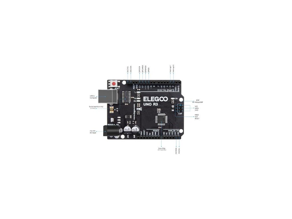 Placa de control UNO R3, Arduino Official IDE si software de programare ElegooKit, procesor model 1.2GHz Procesor Cortex A8, microcontroler CH340C, USB, potrivit de la 10 aniParametri suplimentari