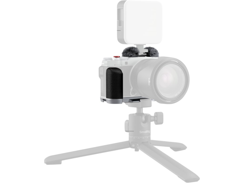 Mânerul în formă de L se atașează la cameră cu un șurub de 1/4"-20 în partea de jos, iar tampoanele de silicon încorporate previn zgârieturile.