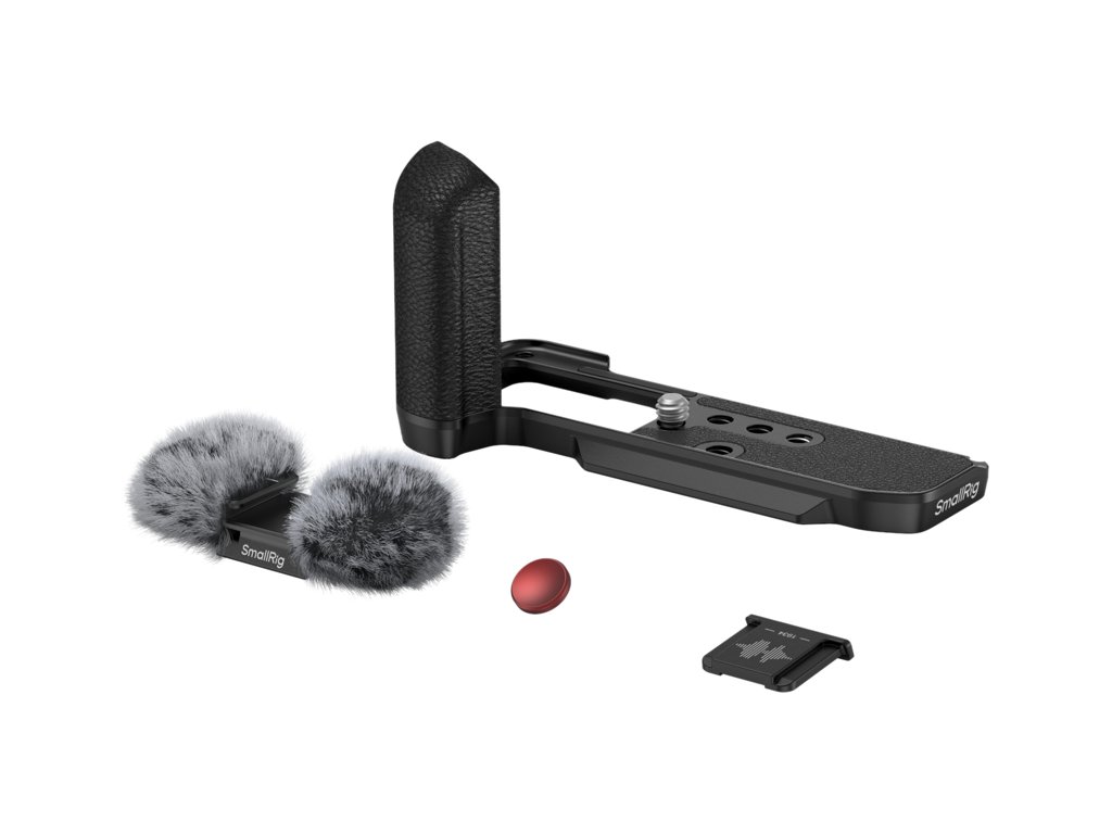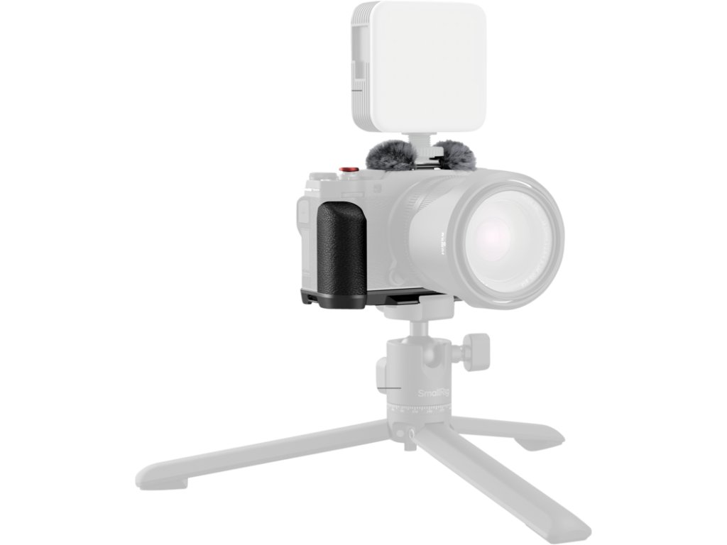 Mânerul în formă de L se atașează la cameră cu un șurub de 1/4"-20 în partea de jos, iar tampoanele de silicon încorporate previn zgârieturile.