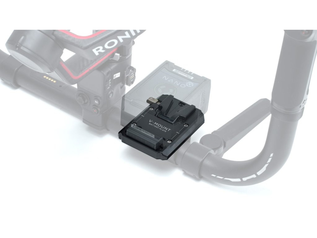 Această placă pentru baterie V-Mount se atașează direct la mânerul inel de bază sau avansat pentru RS 2 și vă permite să vă alimentați cardanul cu baterii V-Mount de capacitate mai mare, fără cabluri externe.
