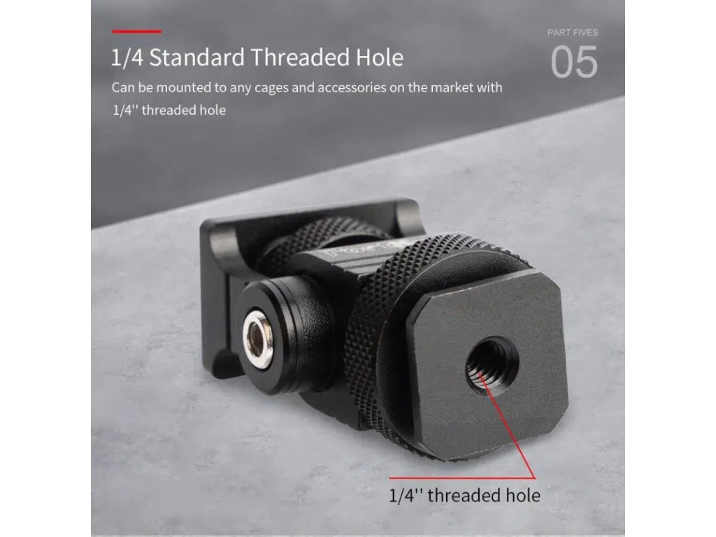 - Este atașat la cameră, cușcă, mâner folosind cold Shoe Mount.
