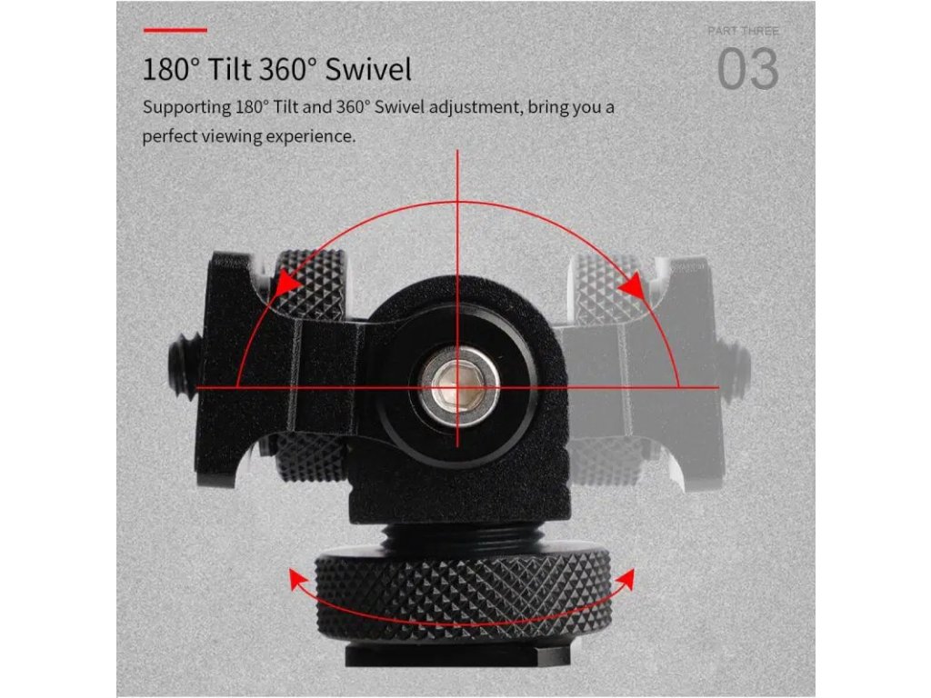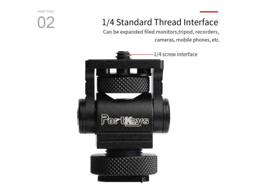 Cu o interfață filetată standard de 1/4 inch, poate fi extins pentru a include monitoare, trepiede, recordere, camere, telefoane mobile etc.Orificiul filetat standard de 1/4" poate fi montat pe orice cușcă și accesoriu de pe piață cu orificiu filetat de 1/4"