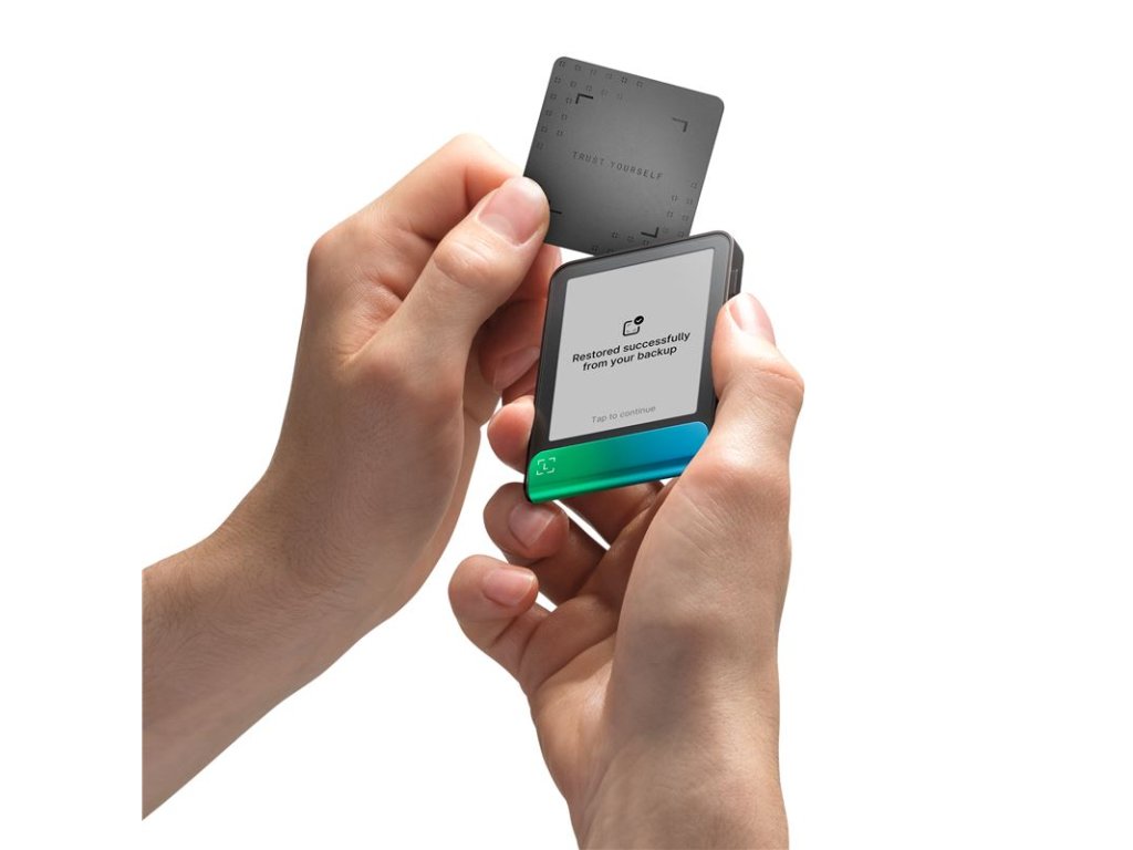 Cheia de recuperare Ledger, protejată prin PIN și mereu offline, este copia ta de rezervă privată pentru a restaura instantaneu accesul la activele tale cu o simplă atingere și este acum inclusă la fiecare achiziție a unui dispozitiv cu ecran tactil Ledger.