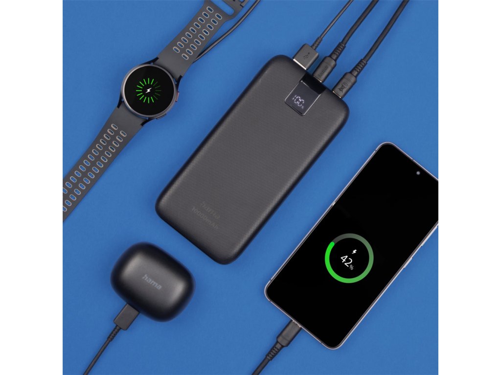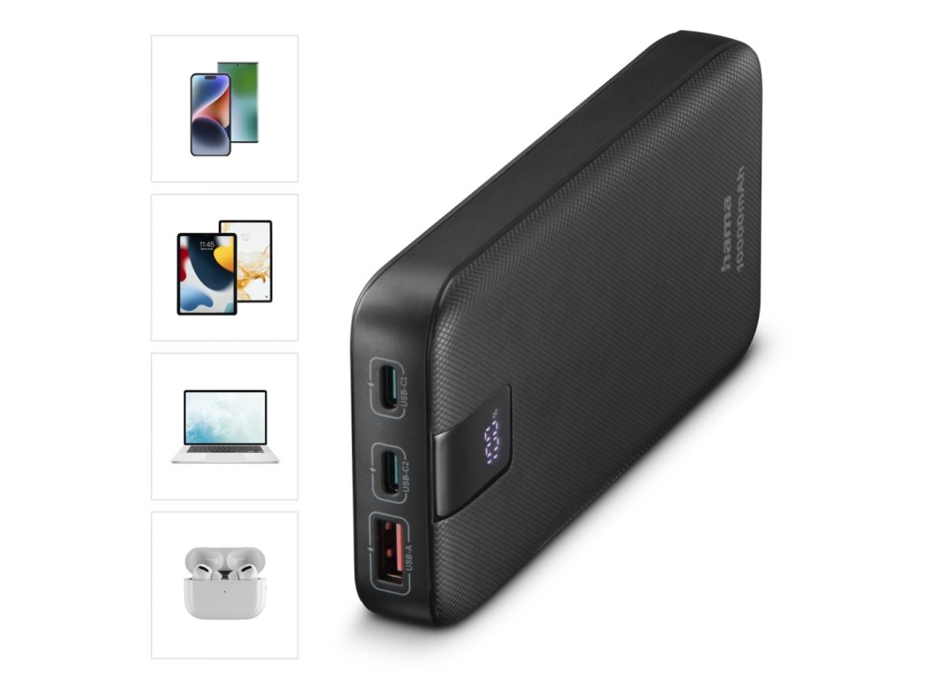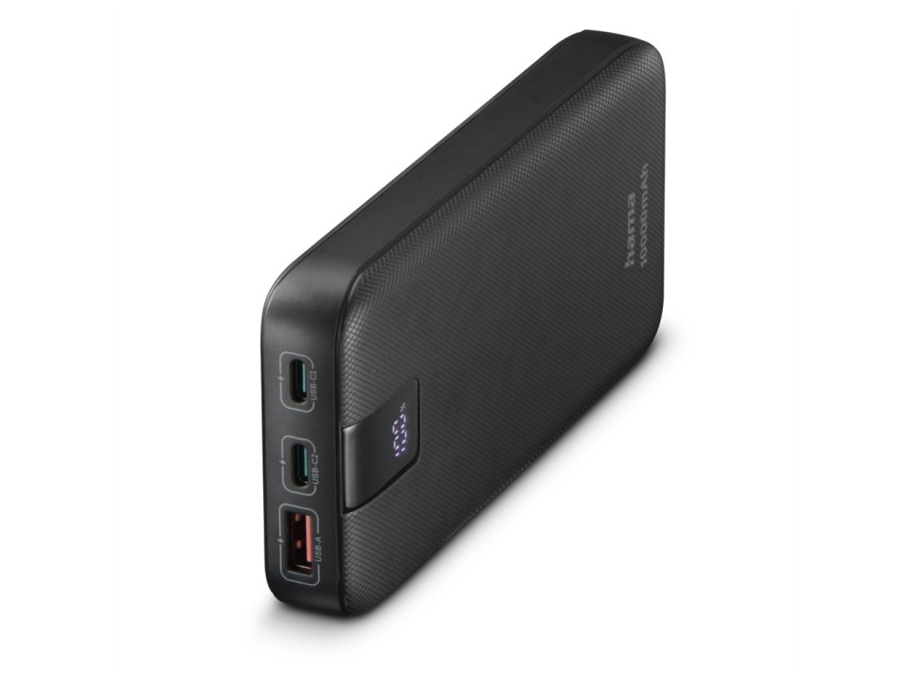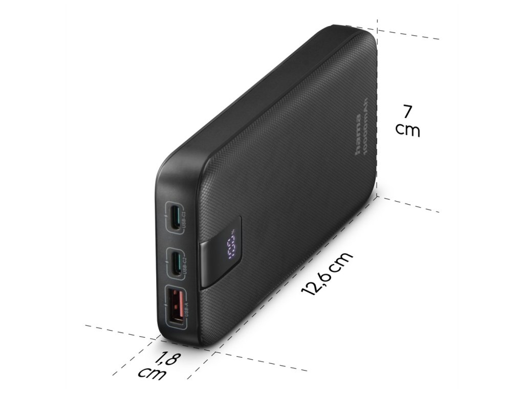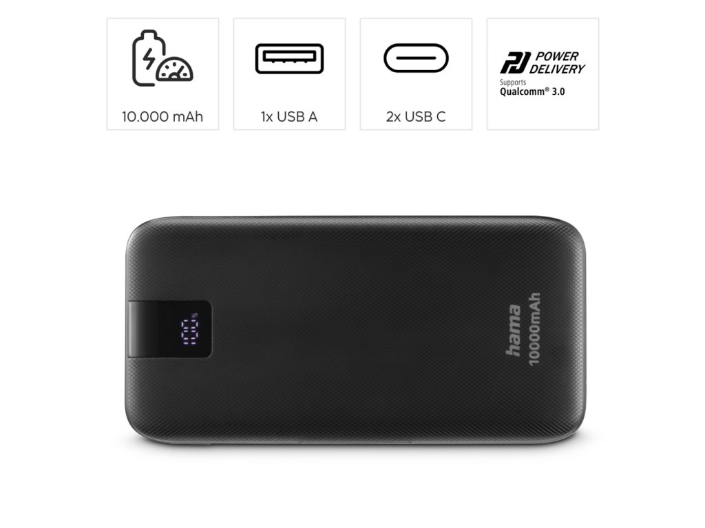 Powerbank Hama PD 10, 10000 mAh, 3 ieșiri: 2x USB-C, 1x USB-A, afișaj LED, PD, Qualcomm