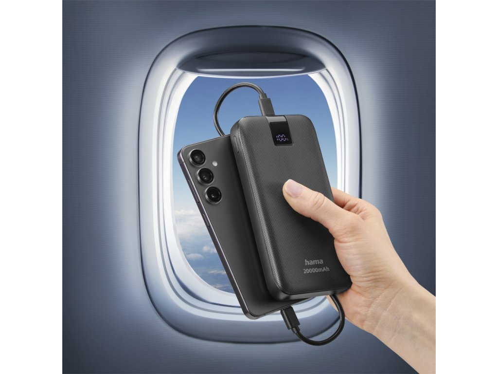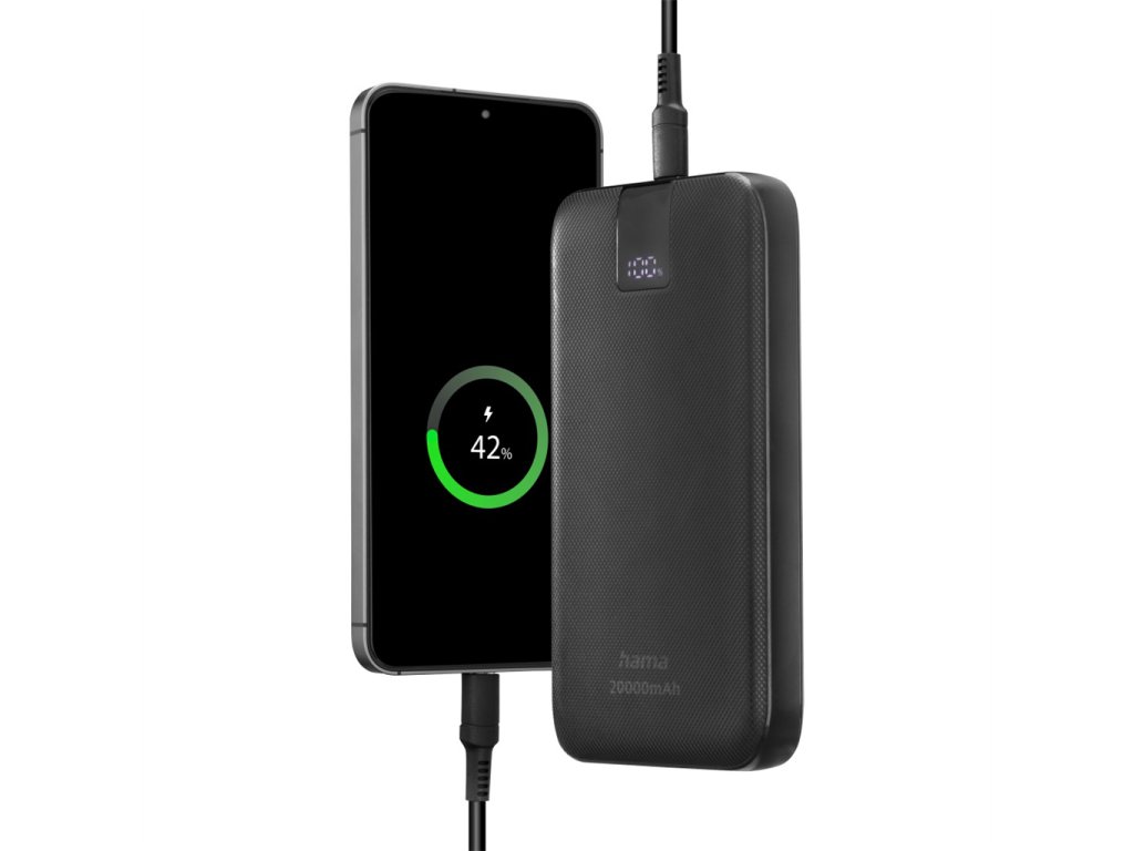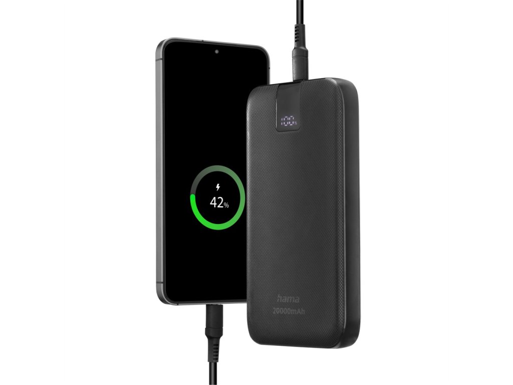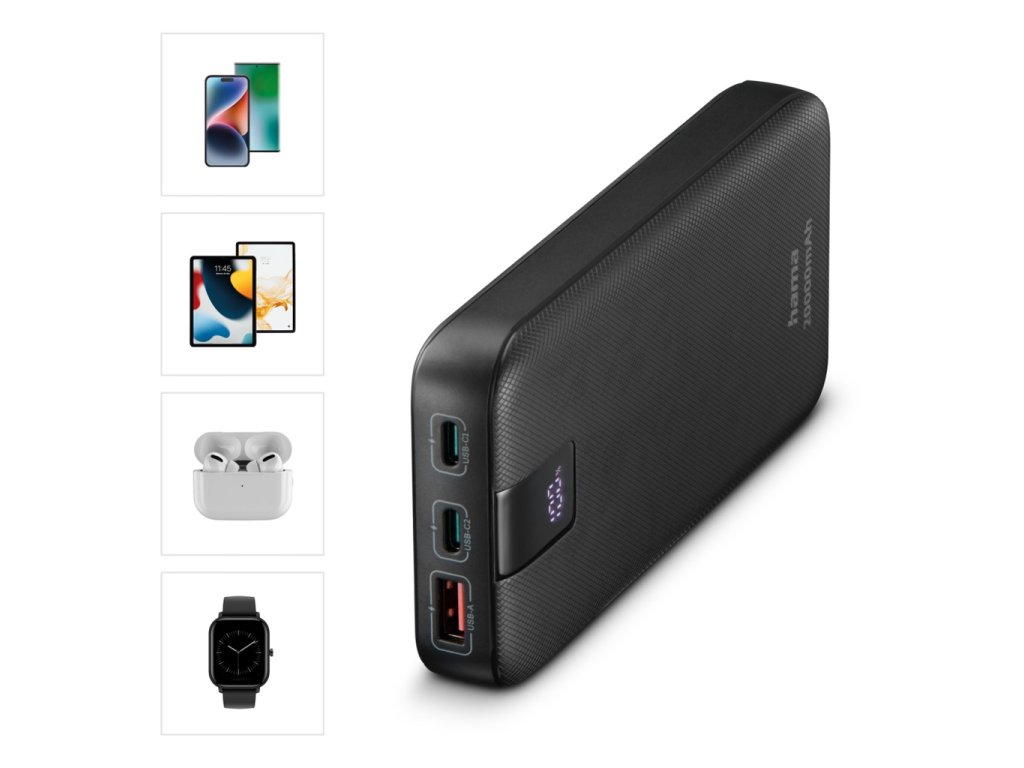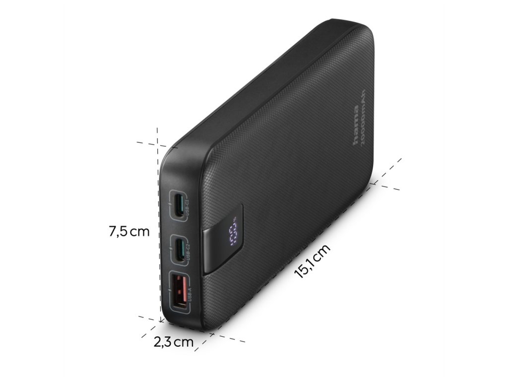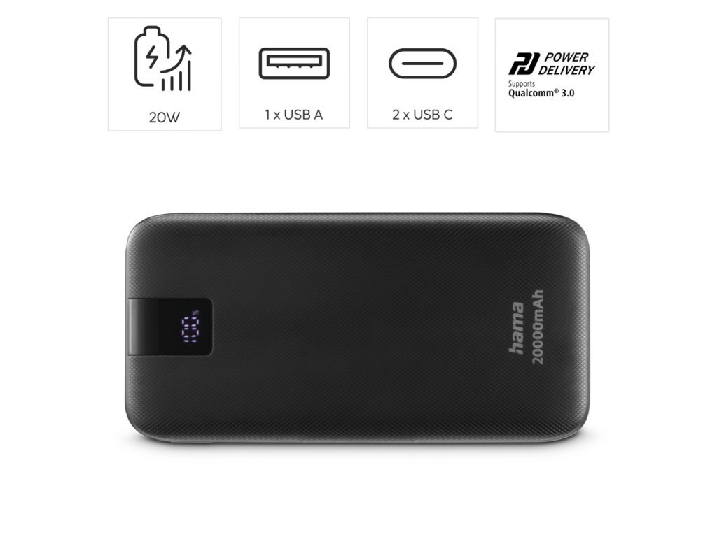 Powerbank Hama PD20-HD, 20000 mAh, 3 ieșiri: 2x USB-C, 1x USB-A, afișaj LED, PD, Qualcomm