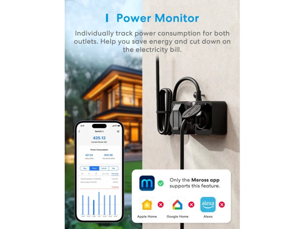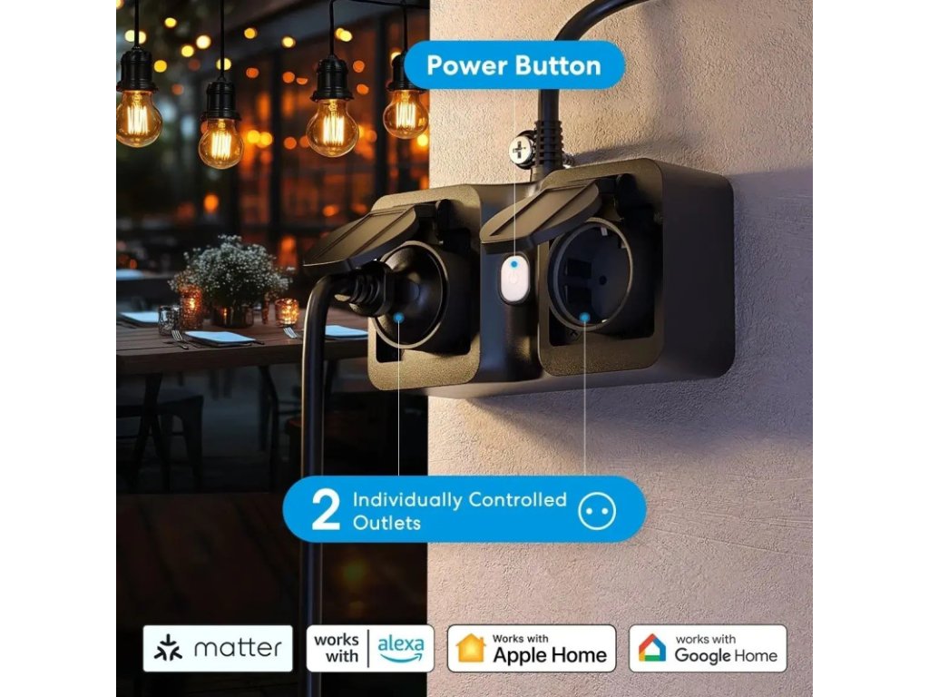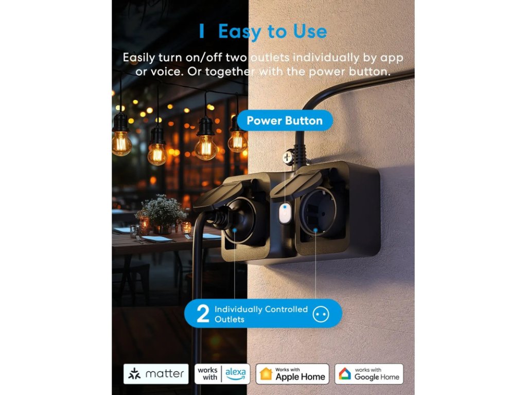 Priză exterioară inteligentă Wi-Fi Meross Matter cu contorizare a consumului, MOP320MA (versiunea UE)