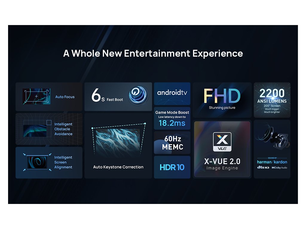 Proiector LED, Full HD (1920×1080), difuzoare Harman Kardon 2× 8W, 2200 ANSI lm, funcții automate inteligente
