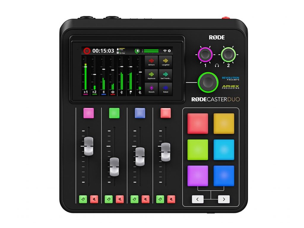 Mixaj studio compact pentru podcast și streaming, 2 intrări analogice - microfon/linie/instrument, 2x ieșire pentru căști, 1x intrare pentru căști, ieșire monitor audio, 2x USB-C, Wi-Fi, Ethenet, Bluetooth®, receptor pentru wireless RODE, 4 fizice și 3 fadere virtuale, afișaj LCD de 5,5 inchi, procesoare APHEX®, efecte RODE FX