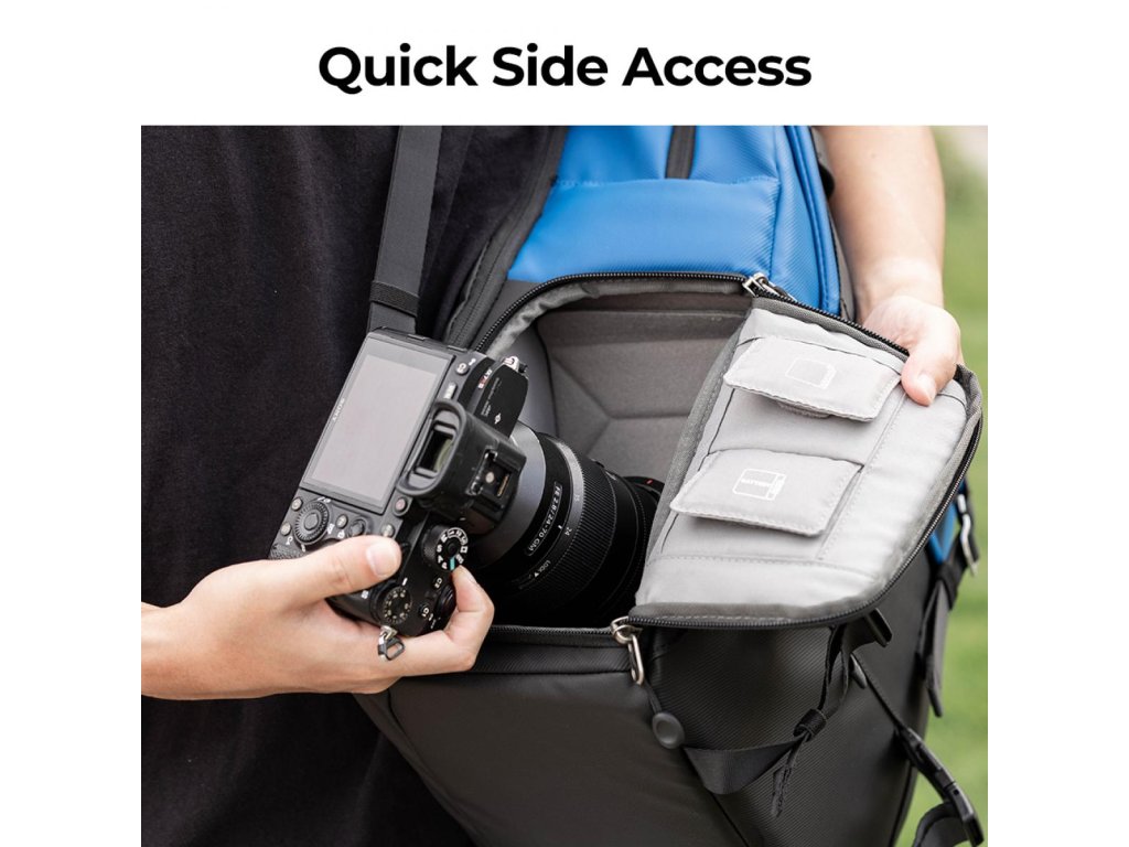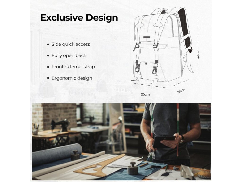 * ?Conceput pentru fotografi? Buzunare interne speciale concepute pentru depozitarea pieselor de schimb fotografice precum filtre, inele adaptoare etc. Buzunar frontal ascuns pentru depozitarea accesoriilor de zi cu zi. Buzunarele laterale pot ține o sticlă de apă sau o umbrelă.