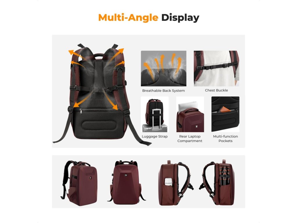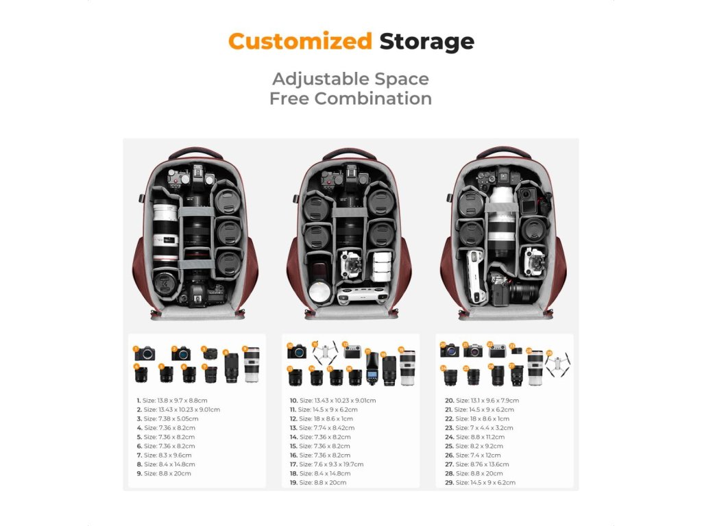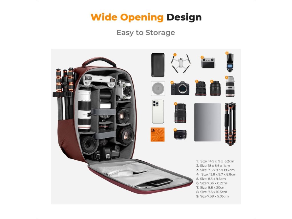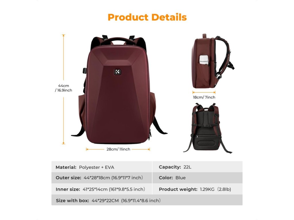 44cm * 30cm * 19cm. Capacitate: 22L; Acest rucsac multifuncțional cu carcasă rigidă este conceput pentru diverse mărci de camere DSLR/SLR/mirrorless. Inserțiile modulare detașabile servesc ca partiții separate pentru diverse camere, blițuri și obiective. Buzunarul din spate este un compartiment pentru laptop care poate găzdui laptopuri de până la 15,6 inci. Partea frontală are o clapă rigidă complet deschisă, care protejează camera de lovituri și zgârieturi. Geantă foto cu 2 buzunare interne pentru accesorii pentru a depozita cabluri, carduri SD și baterie externă. 1 buzunar ascuns cu fermoar pe spate pentru telefon, portofel și alte obiecte mici. Suportul pentru trepied este echipat cu o curea sigură pe o parte a genții. 1 buzunar pe cealaltă parte oferă spațiu pentru o umbrelă sau o sticlă de apă.