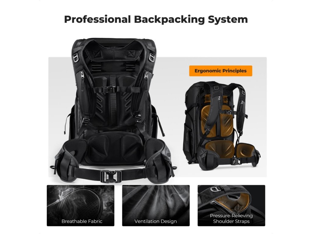 - * 【Spătar ergonomic și bretele reglabile】Echipat cu un sistem de bretele de umăr reglabile pe 3 niveluri pentru a se adapta diferitelor tipuri de corp. Panoul din spate căptușit și plasa respirabilă oferă un confort excelent pentru ședințe foto de lungă durată sau aventuri în aer liber.